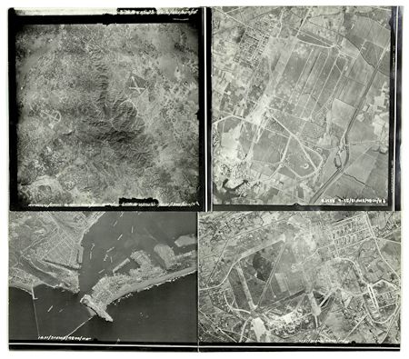 An interesting group of four "restricted" aerial photographs measuring 10" square b/w. Each shows the coordinates and accompanying craters caused by the bombing. Very good condition, four pieces.