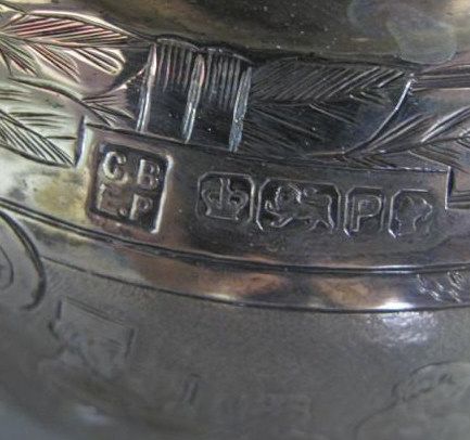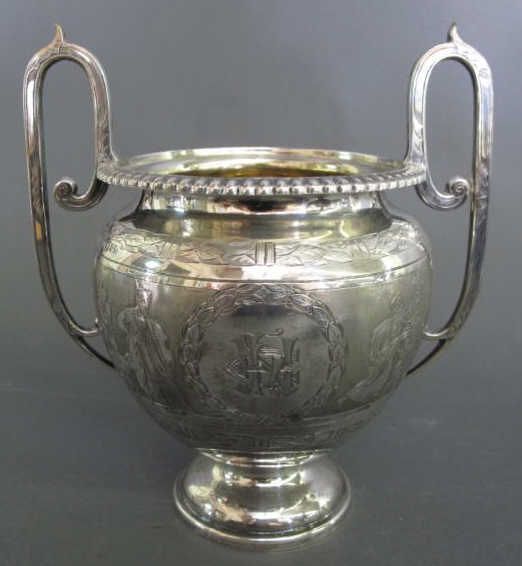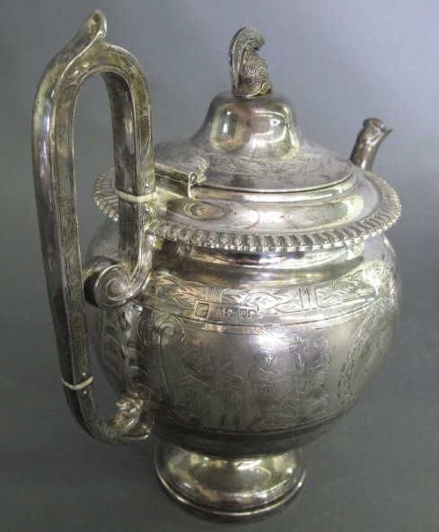 -by Charles Belk & E. Parkin, Furnival Works, Sheffield, 1882. Three piece service (.925) comprised of teapot, open sugar and creamer. Each with engraved Grecian frieze design, the teapot with ivory insulators & a helmet finial.