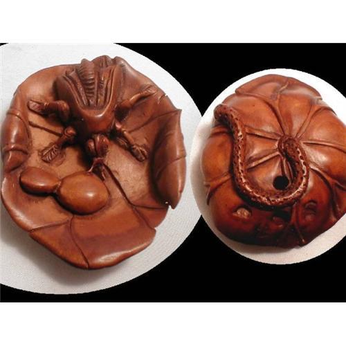 What a beautiful piece of signed workmanship this is! One side has the beetle on the leaf and the other is the snake. There are two holes on the back and it could easily be a pendant or sewn on as a button.It is large ( 2 1/2" x 2") and although a bit strange it is a common piece like the aesthetic movement. During that period in the late 1800's, Darwin's controversial theories on evolution, as well as new botanical discoveries taking place, created quite an interest in the natural world. Personal adornments and vanity items reflected these new interests with jewelry created in forms of insects and animals.The signature on this is in chinese.