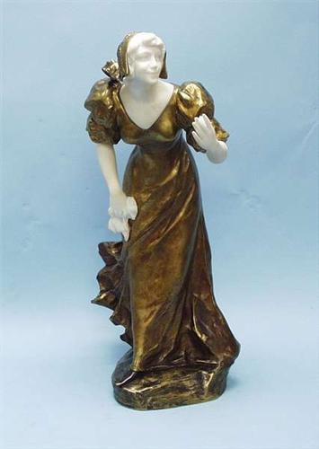 AFFORTUNATO GORY (GORY) (1895-1925) French school. "Waiting". A rare gilt bronze and Carrara marble figure of a belle epoque young lady with carved marble face, bust and arms. Signed and bearing French bronze stamp on the naturalistic bronze base. 27" high. Circa 1900.  28000-32000