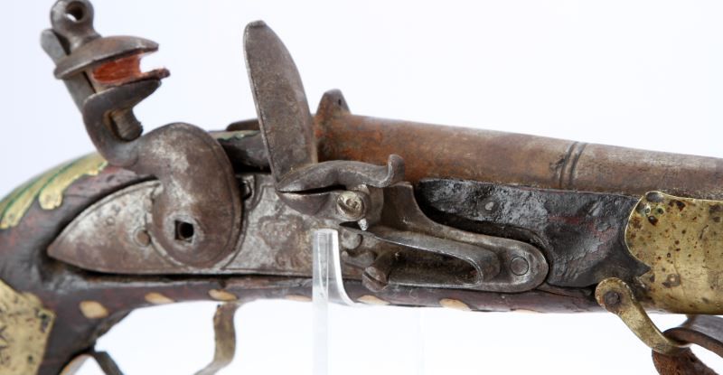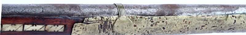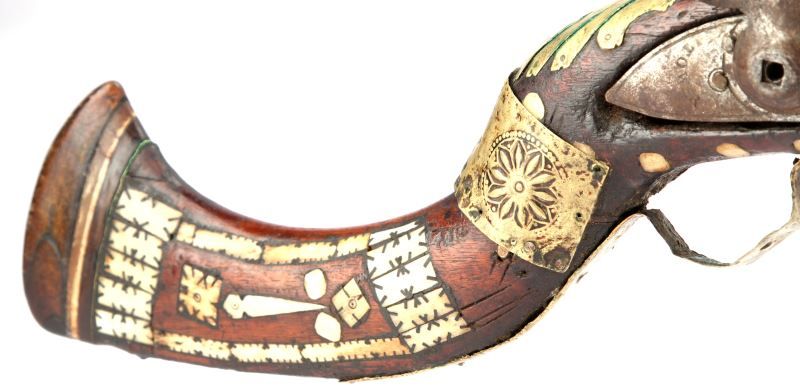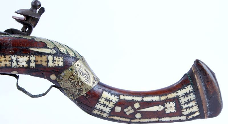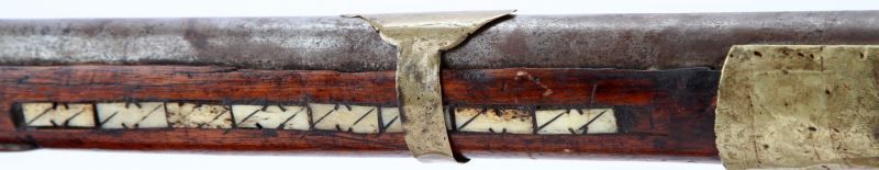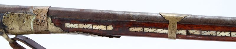 Afghan Flintlock jezail musket. Decorative bone inlay on stock, with hammered brass decorations and barrel bands. 44 inch barrel, and characteristic curved butt stock. Tower lock with crown over "GR" and British proof mark. Many of these arms were typically equipped with lock mechanisms removed from stolen, captured, or discarded British weapons such as the Brown Bess during the First Anglo-Afghan War. Rifle is in typically worn condition. Mechanically inoperable, with missing trigger, and loose lock, but would serve well as a historic decoration or conversation piece. Serial #: None This lot has a reserve.