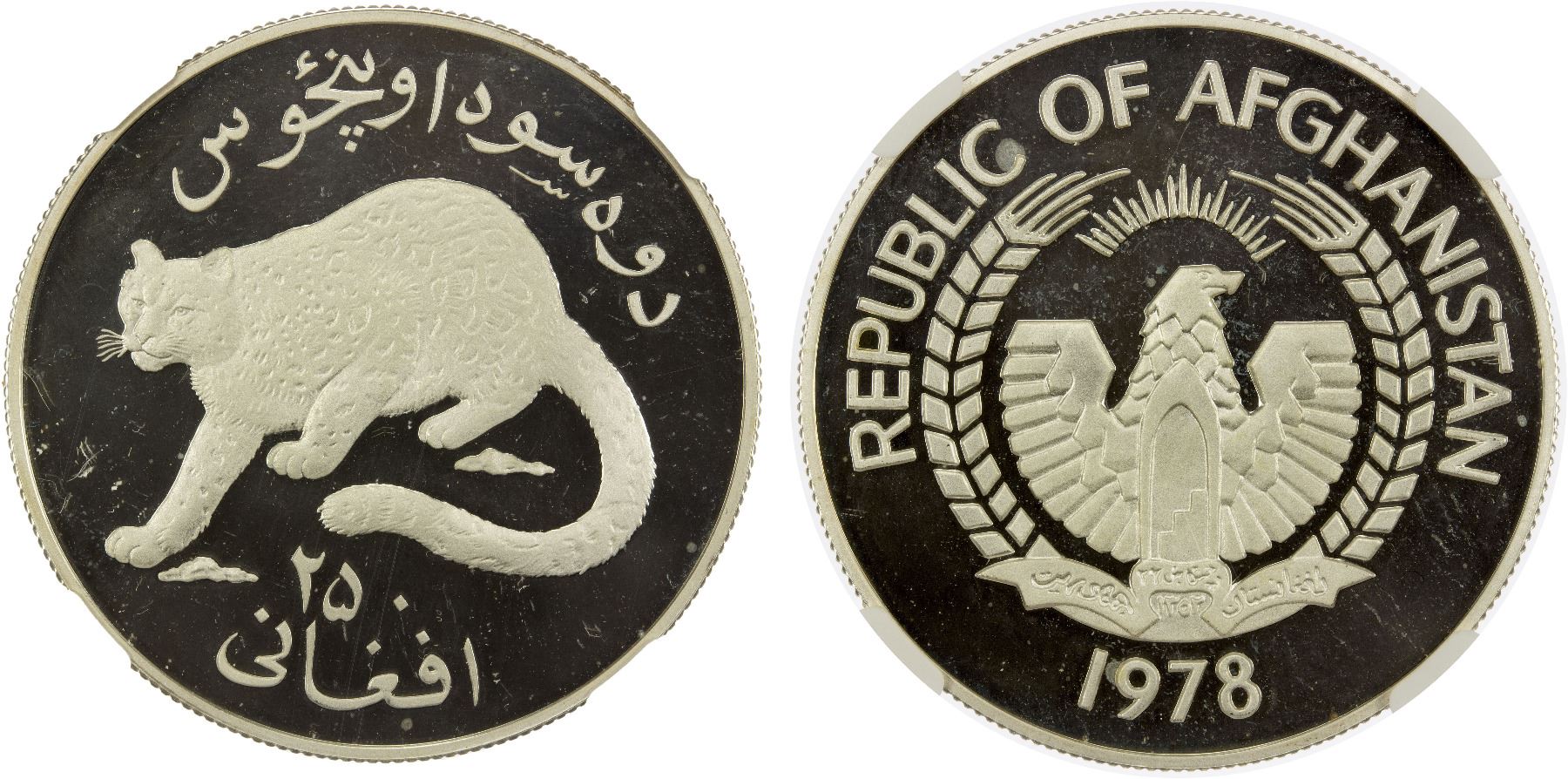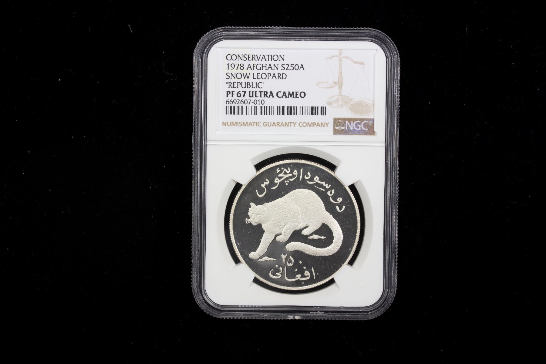 AFGHANISTAN: Democratic Republic, AR 250 afghanis, 1978, KM-979, Schön-98a, World Wildlife Fund - Snow Leopard, struck at the British Royal Mint, NGC graded Proof 67 ULTRA CAMEO.
