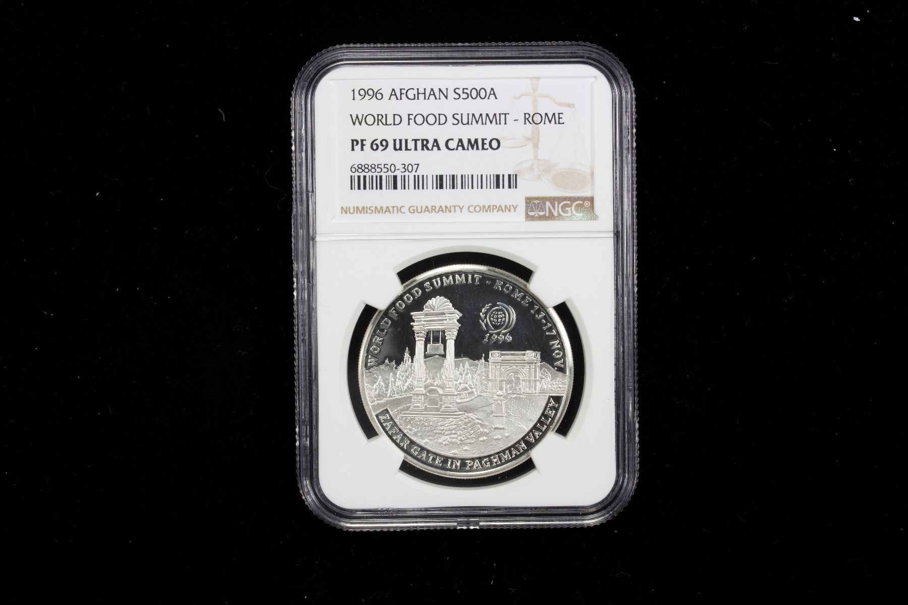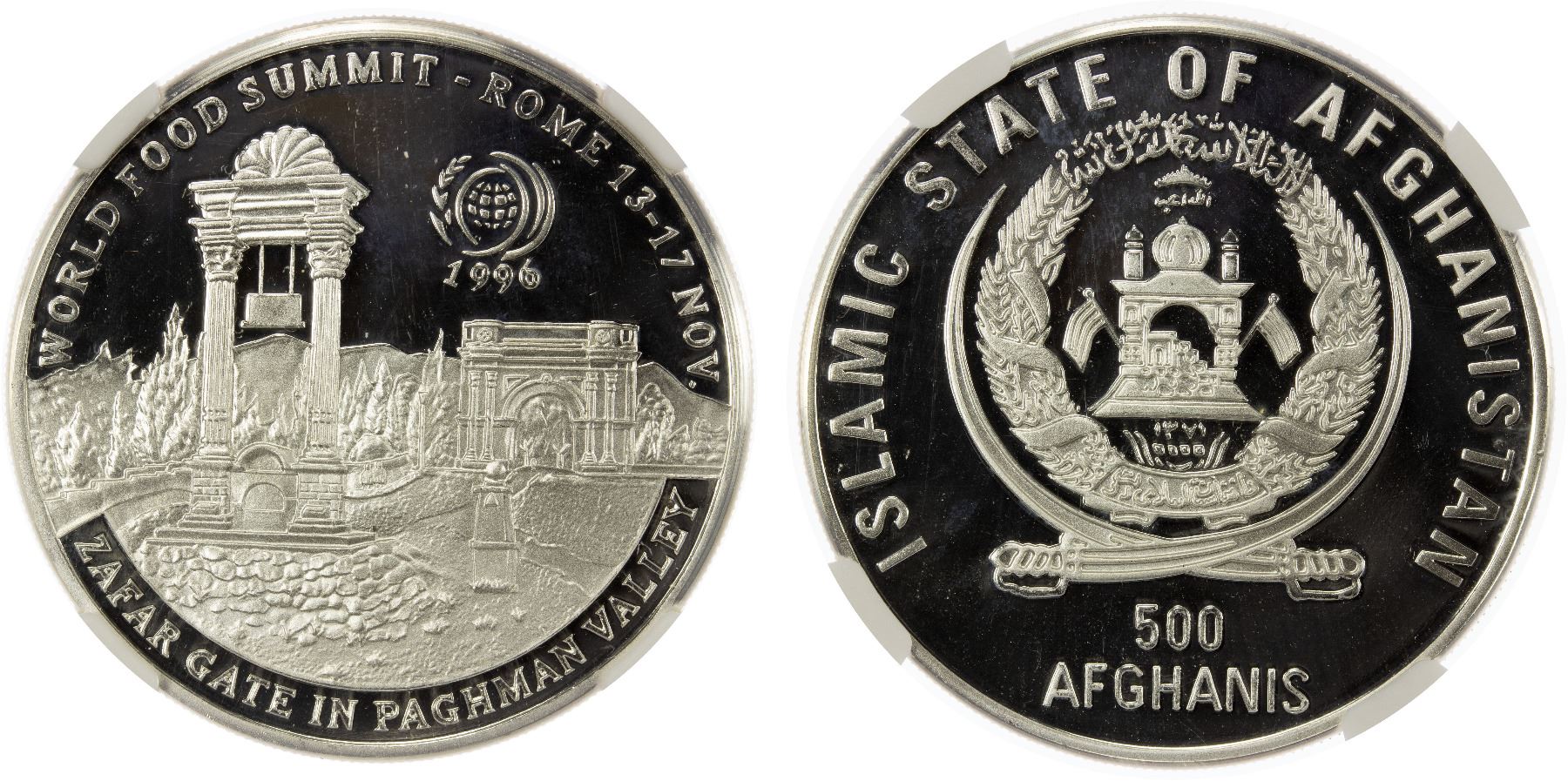 AFGHANISTAN: Islamic State, AR 500 afghanis, 1996, KM-1028, World Food Summit, an extraordinary example, NGC graded PF69 Ultra Cameo.