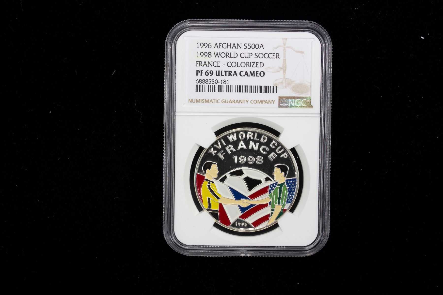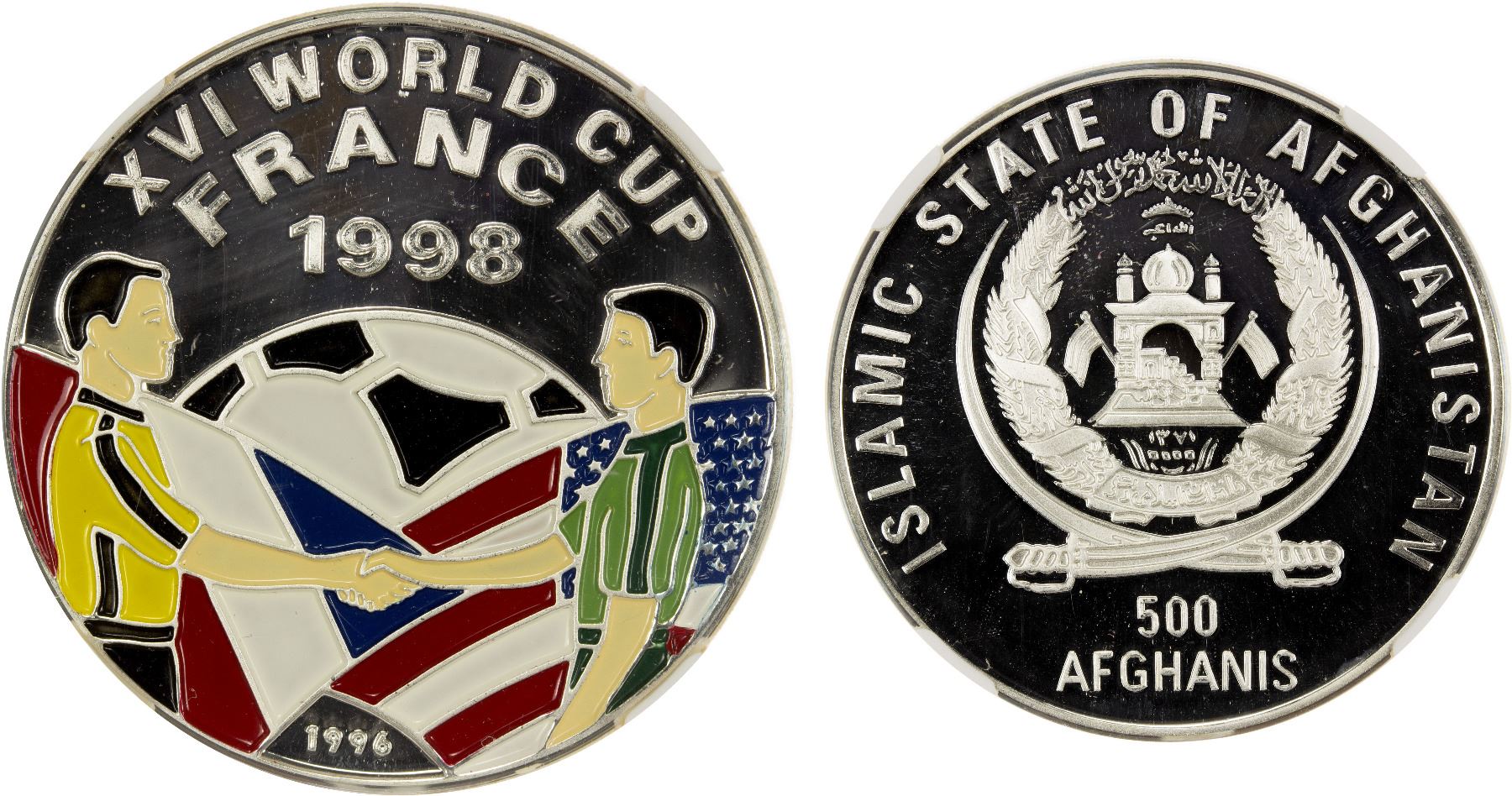AFGHANISTAN: Islamic State, AR 500 afghanis, 1996, KM-1040, FIFA World Cup 1998, an extraordinary example, NGC graded PF69 Ultra Cameo.