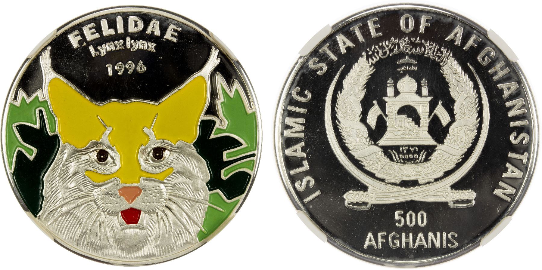 AFGHANISTAN: Islamic State, AR 500 afghanis, 1996, KM-1025, Conservation Series- Lynx, an extraordinary example struck at the Havana mint with multicolor reverse, NGC graded PF69 Ultra Cameo.