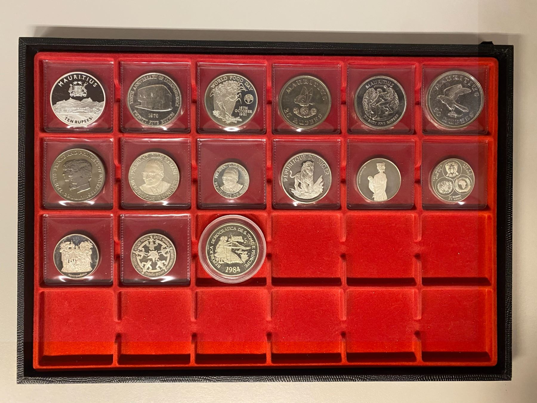 AFRICA: LOT of 15 coins, including Mauritius (7 pcs, KM-40, 41, 43, 44, 46, 48, and 62), Niger (3, including 2 essais: KM-8.1, E5, and E6), and St. Thomas and Prince Islands (5, KM-32, 33, 34, 35, 43); all are unc or proof or nearly so, in consignor's 2x2 flips and capsules, all except 2 are silver, viewing recommended; retail value $600, lot of 15 items, ex Dr. Wolfgang Schuster Collection.