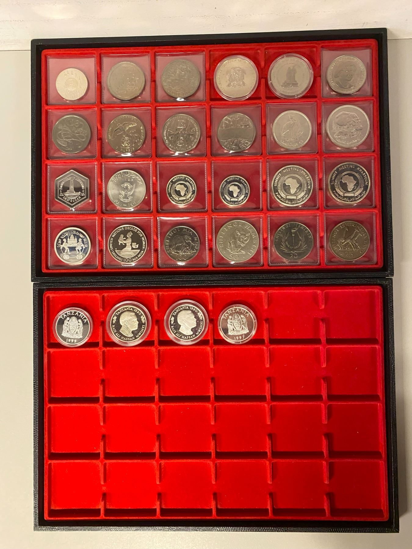 AFRICA: LOT of 28 coins, including St. Thomas and Prince Islands (4 pcs, KM-31, 41, 42, and 86a), Seychelles (6, KM-20, 85, 89, 109, 112, and 114), Sudan (9, KM-70, 71, 76 w/o cmks, 76 w/cmks, 77 w/o cmks, 77 w/cmks, 86, 87, 88), and Tanzania (9, KM-7, 8, 16, 18, 21, 24 [2 pcs], 40, and 41); all are unc or proof or nearly so, in consignor's 2x2 flips and capsules, most are silver, viewing recommended; retail value $975, lot of 28 items, ex Dr. Wolfgang Schuster Collection.