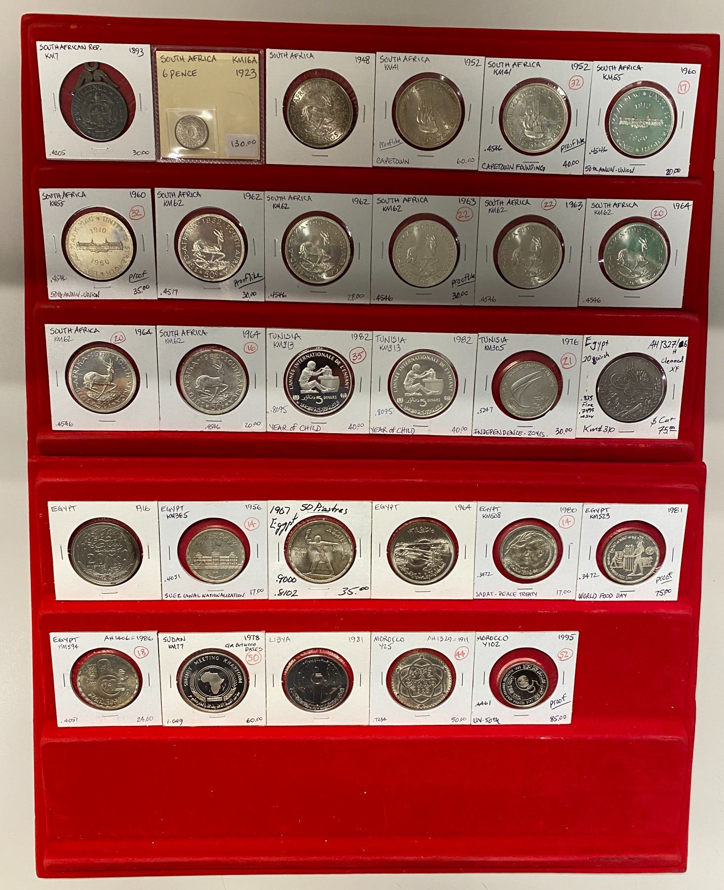 AFRICA: LOT of 29 coins, including South Africa (14), Morocco (2), Libya, Sudan, Egypt (8), and Tunisia (3), all silver, the majority of which are crowns; retail value $800, lot of 29 pieces.