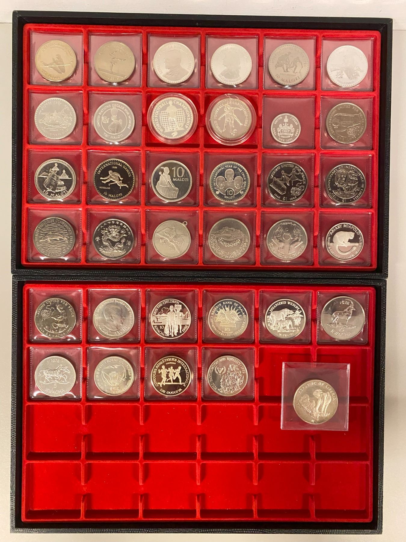 AFRICA: LOT of 35 coins, including Guinea-Bissau (2 pcs, KM-22 and KM-24), Lesotho (14, KM-13, 23, 24, 32, 34, 40, 41, 42, 46, 47, 48, 49, 50, and 60), Liberia (5, KM-29, 47, 313, 344, and 412), Libya (3, including one AR medal: KM-24, Bruce-X4, and The Green Book medal), Madagascar (1, KM-15), Malawi (7, KM-13, 14, 15, 16, 21, 23, and 35), Mali (1, KM-1), Mauritania (1, Schön-8), and Mauritius (1, KM-49); all are unc or proof or nearly so, in consignor's 2x2 flips and capsules, most are silver, viewing recommended; retail value $1000, lot of 35 items, ex Dr. Wolfgang Schuster Collection.