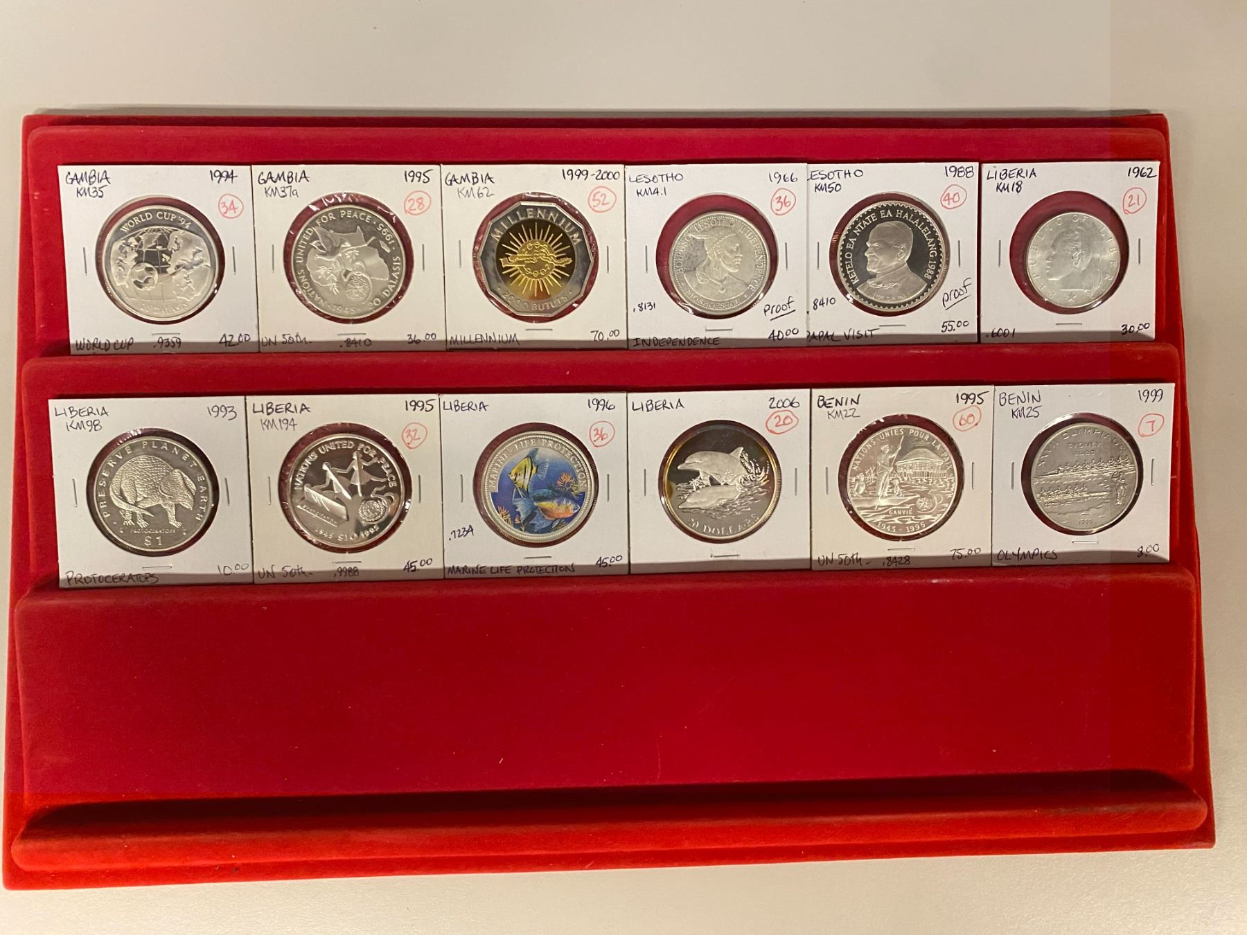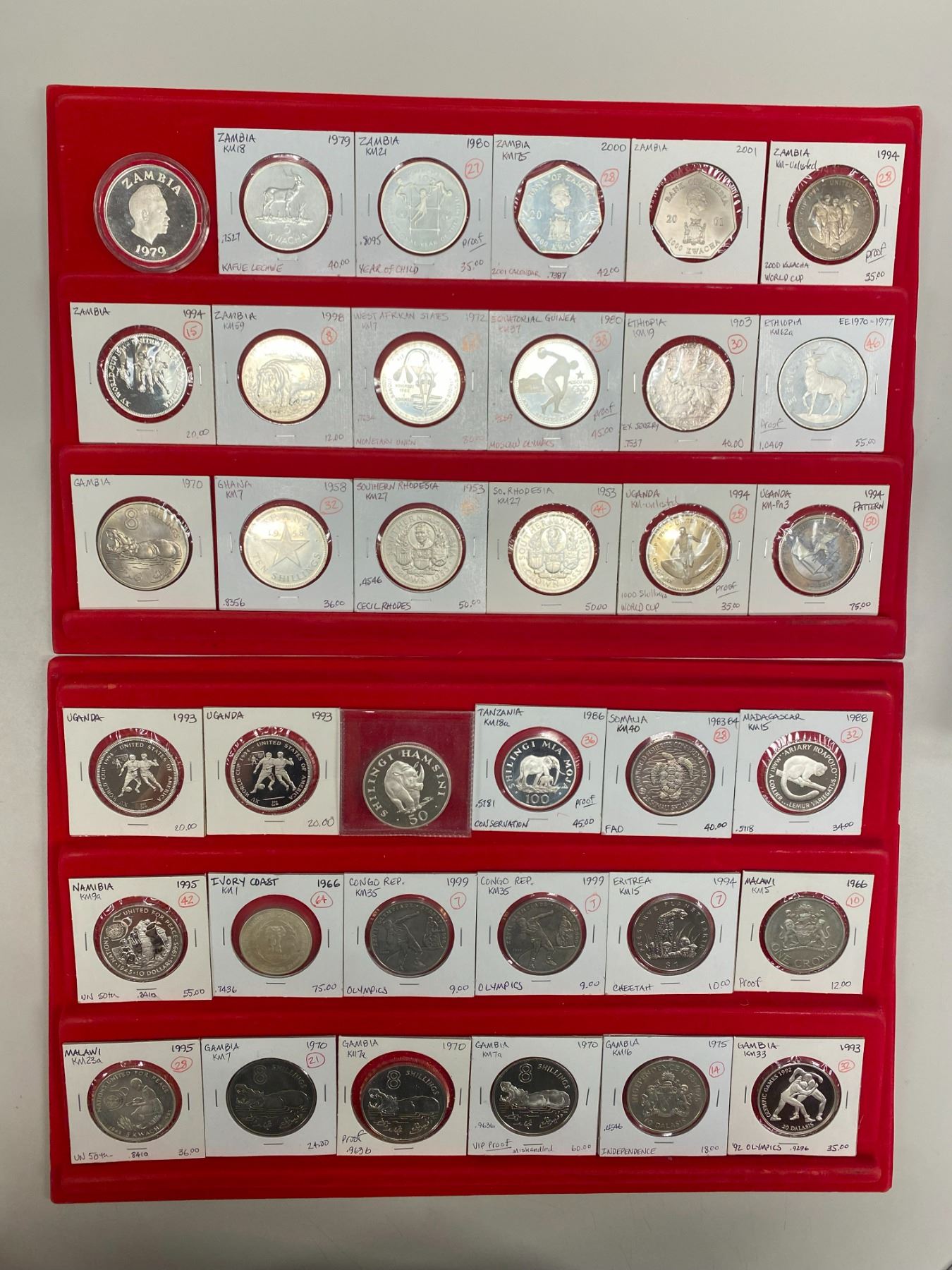 AFRICA: LOT of 48 coins, including Benin (2), Liberia (5), Lesotho (2), Gambia (8), Malawi (2), Eritrea (1), Congo (2), Ivory Coast (1), Namibia (1), Madagascar (1), Somalia (1), Tanzania (2), Uganda (4), Southern Rhodesia (2), Ghana (1), Gambia (1), Ethiopia (2), Equatorial Guinea (1), West African States (1), and Zambia (8), the majority of which are silver; retail value $1,000, lot of 48 pieces.