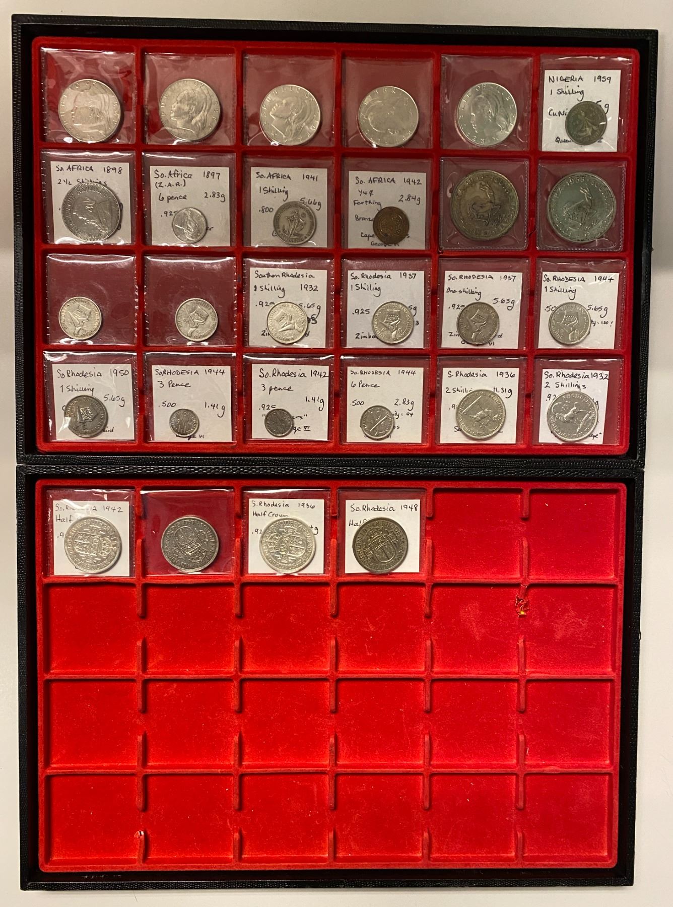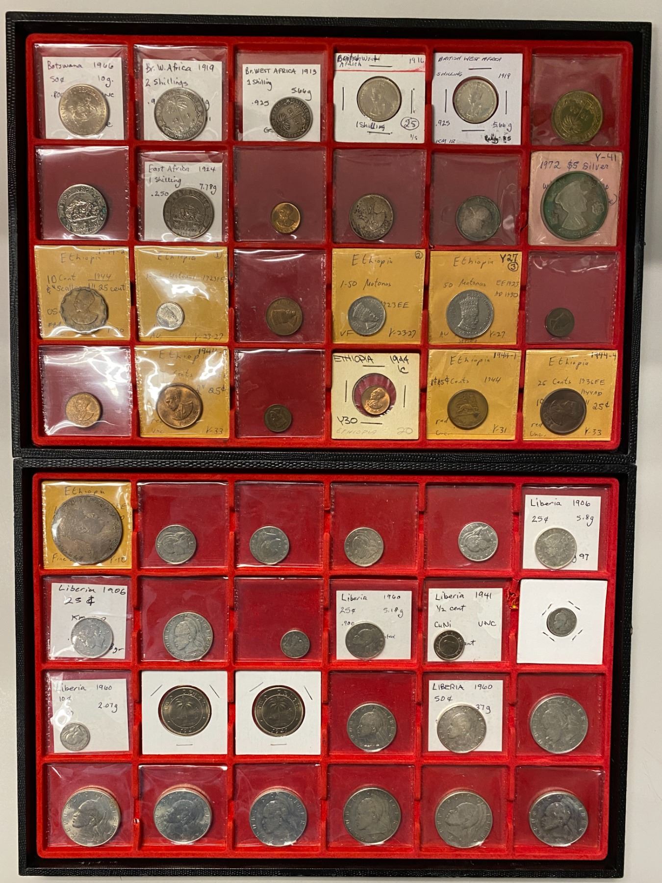 AFRICA: LOT of 76 coins, including Botswana (1 pc), British West Africa (5), East Africa (2), Ethiopia (17), Liberia (28), Nigeria (1), South Africa (6), and Southern Rhodesia (16); average circulated grades, as well as some uncs, most are silver, in consignor's 2x2 holders, viewing recommended; retail value $975, lot of 76 coins.
