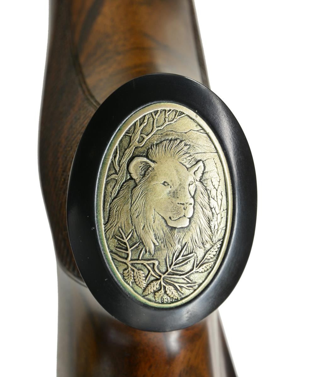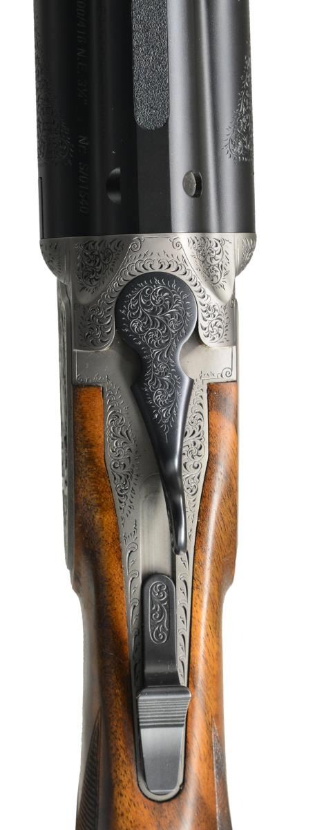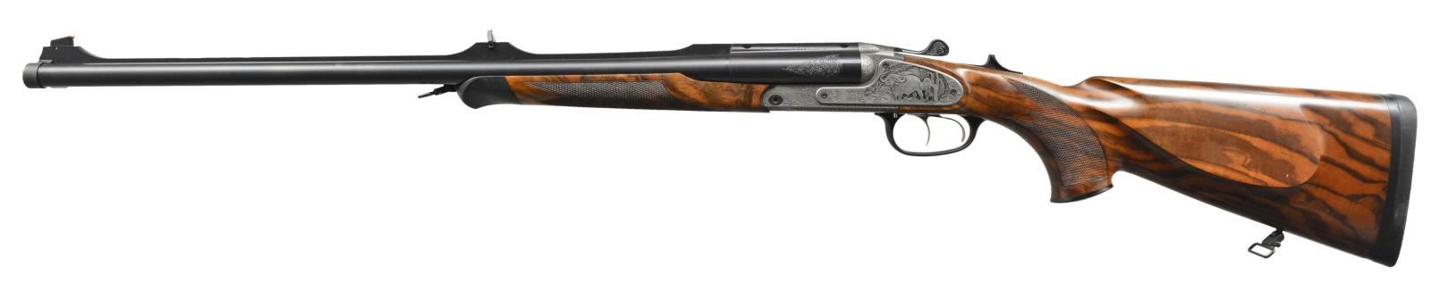 DOUBLE RIFLE IN 500/416 NE. Cal. 500/416 NE. S# S/01540. Mono bloc barrel set is 24 3/8”, fitted with narrow full length top rib with portions milled away leaving bases for single leaf rear and gold bead front sights. Top portion of mono bloc is milled for Blaser scope rings. Factory nomenclature is on top left side. Breech ends of mono bloc are engraved with 1” triangles of scroll. Coin finished tipping block action also features top safety/cocking slide and is fitted with ornamental sideplates. Action is engraved with 70% coverage scroll within scroll borders. Sideplates continue matching scroll at front and rear surrounding vignettes of members of the “big five”; two cape buffalo bulls in open woodland are on left plate & lion and lioness are in similar setting on right. Trigger guard is black coated matching barrel, top lever and cocking slide. Broadly striped European walnut capped pistol grip buttstock measures 14 3/4” over black "Universal" pad. Stock is fitted with recoil reducer and features swept right hand cheekpiece, right hand palm swell, point pattern checkering, and composition grip cap with oval silver inset with relief portrait of a lion. A detachable sling loop on toeline matches that on bottom of barrel. Matching semi-beavertail forend with black schnabeled tip has modified Deeley type release. WEIGHT: 10 lbs. 11 oz. CONDITION: appears to be “near new” with little evidence of having been fired since proof, with one or two minor assembly and handling marks in all surfaces. Bores are excellent. Mechanically excellent. Production of Blaser double rifles was discontinued in 2014 when the Super Luxus retailed for over $18,000.00. These rifles remain very highly regarded in Africa, and the caliber is the favorite of many. (20-518/MGM47). MODERN. $10,000-15,000.