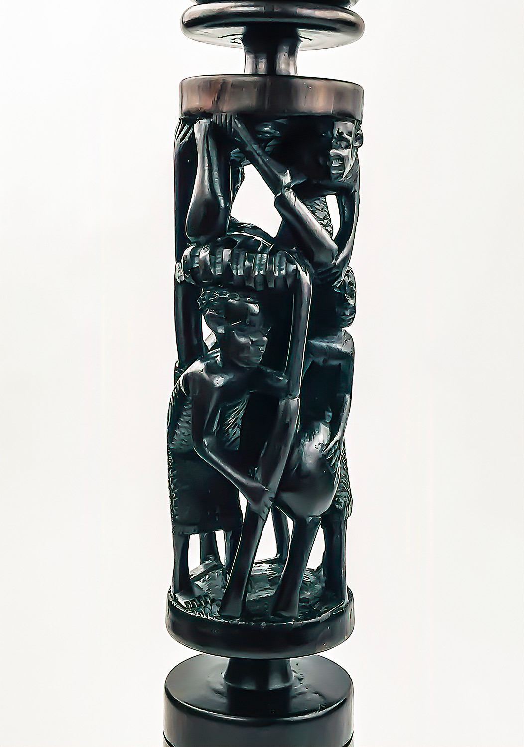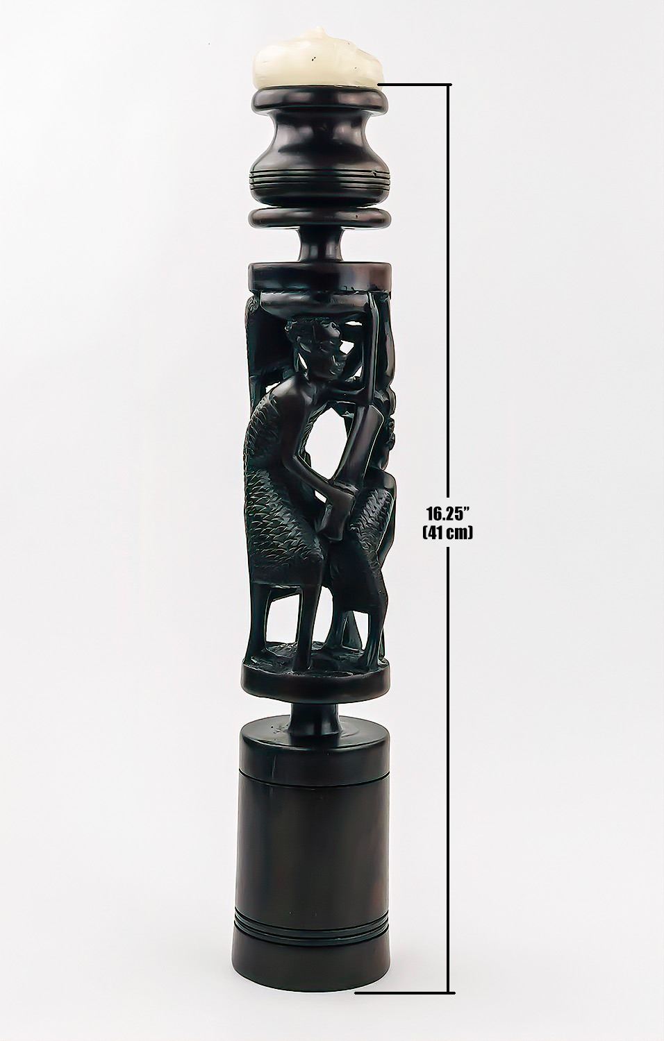 #8382 - LARGE AFRICAN CANDLE HOLDER WOOD CARVING. MEASURES 16.25” (41 CM) TALL, 3” (7.5 CM) DIAMETER