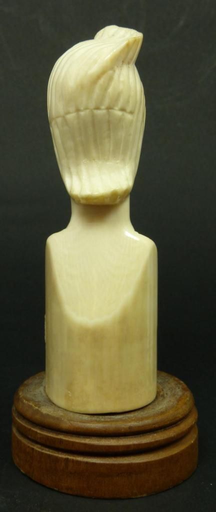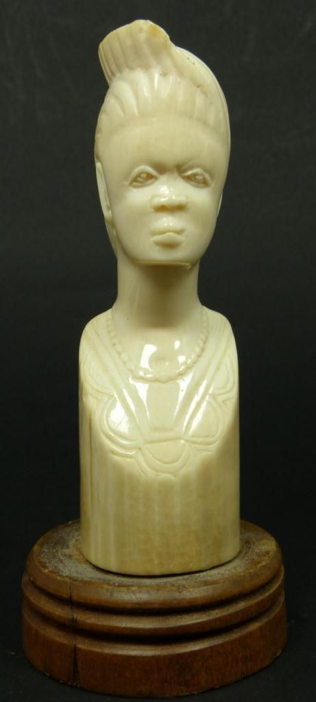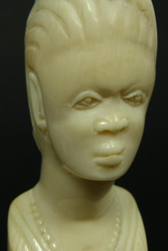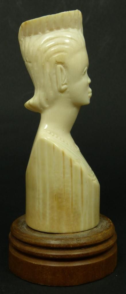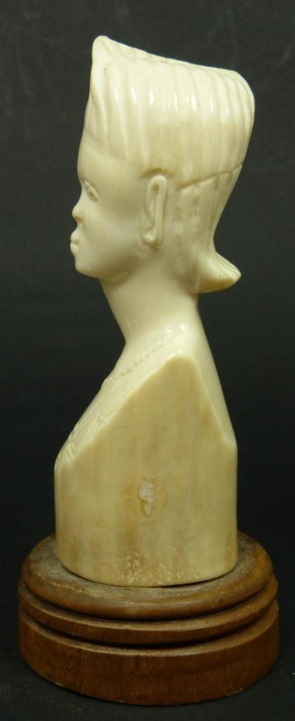 African hand carved ivory bust of female with waved hair. Mounted to round wooden base. 20th century. Measures 5" height + 1" base (12.7cm + 2.5cm). Total weight of 295 grams.