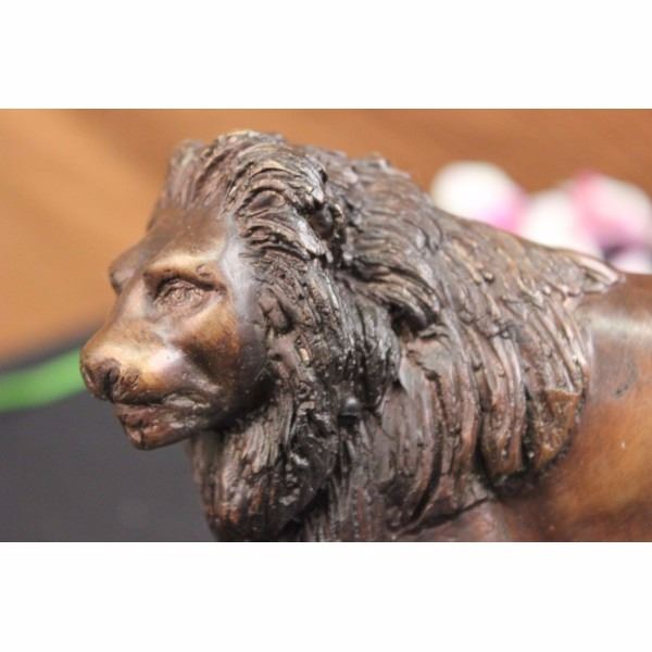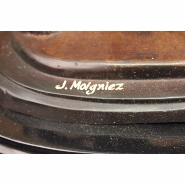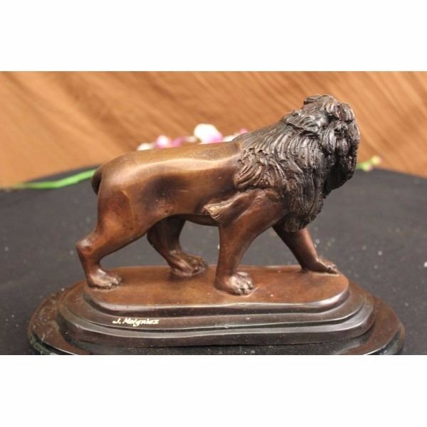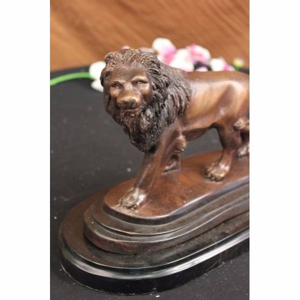 This is a sculpture of the king of the animal kingdom, The Lion. He is powerful, strong and fierce but also passionate towards his mate and cubs. He walks through his domain, standing proud and creating dust which each mighty paw that he puts down. His face resembles the feeling of contentment, his eyes piercing as he wanders with a wide stride. His mane is thick, pronounced with each stroke of the artist’s tools distinguishable from the next. His body is smooth with a muscular tone that shows he may be an older member of his pride. He is 100% handmade and 100% solid bronze cast using the “Lost Wax Methodâ€. He has a two tone brown patina and stands on a solid black marble base. Signed J. Moigniez. We also do have a matching set. Jules Moigniez was born in Senlis sur L'Oise, France in 1835 and died in Saint-Martin-du-Teire, France on May 29, 1894. The son of a metal gilder, Moigniez was a student of Paul Comolera. He debuted at the Exposition Universelle in 1855 with Pointer and Pheasant and Falcon and Weasel each in plaster. He contributed regularly to the Paris Salon from 1859 to 1892 during which he exhibited over thirty sculptures including Pointer and Pheasant and Falcon and Weasel in bronze. He was awarded an honorable mention at the Salon and received a medal in London at the Great Exposition in 1862. He lived most of his life in Paris. During his career he was widely popular in France, England and America. His bronzes were most decorative, particularly those of game birds. He also sculpted dogs, farm animals and equestrian groups. Moigniez's dogs reflected the "naturalism" style of Pierre Jules Mene. His bird sculptures were reminiscent of paintings by deHondecoeter, Casteels and Snyders. His sculptures of birds reflect dynamic movement, as if captured through a high-speed photographic portrait. Moigniez bronzes were edited, (cast), by the foundry his father opened in 1857. A wide variety of patinations, including silver plate, golden bronze and gilding were unique to these lifetime casts. Condition: This sculpture is in a very Good condition. Bronze Dimensions with Marble Base:Height 8" x Width 12" Marble Dimensions: diameter 12" Height without base: 7" Weight : 13 LBS Inventory : 254052147M52