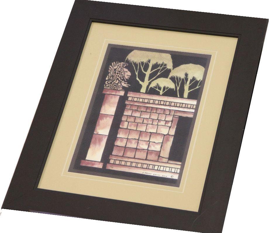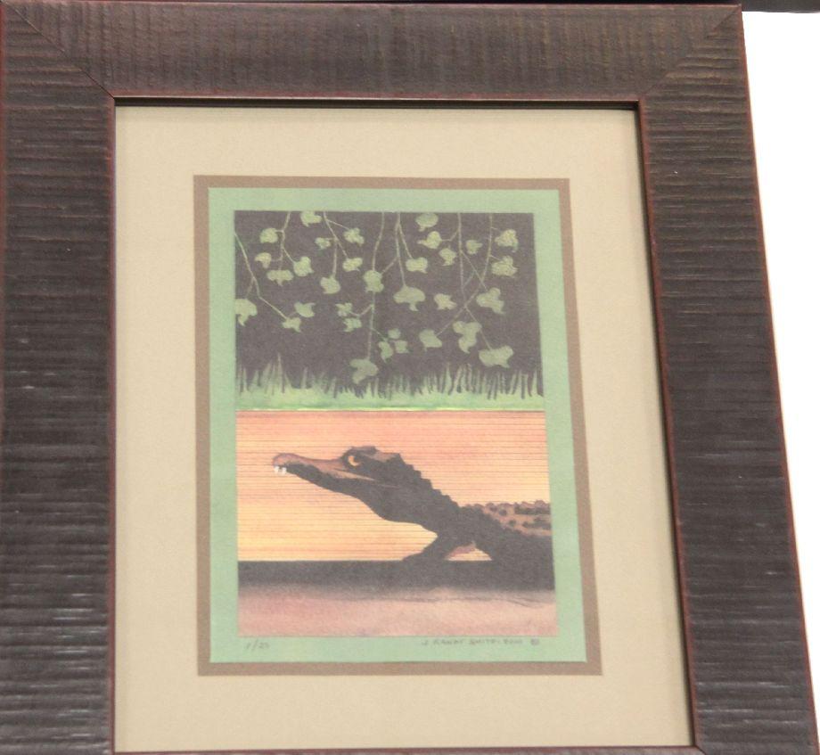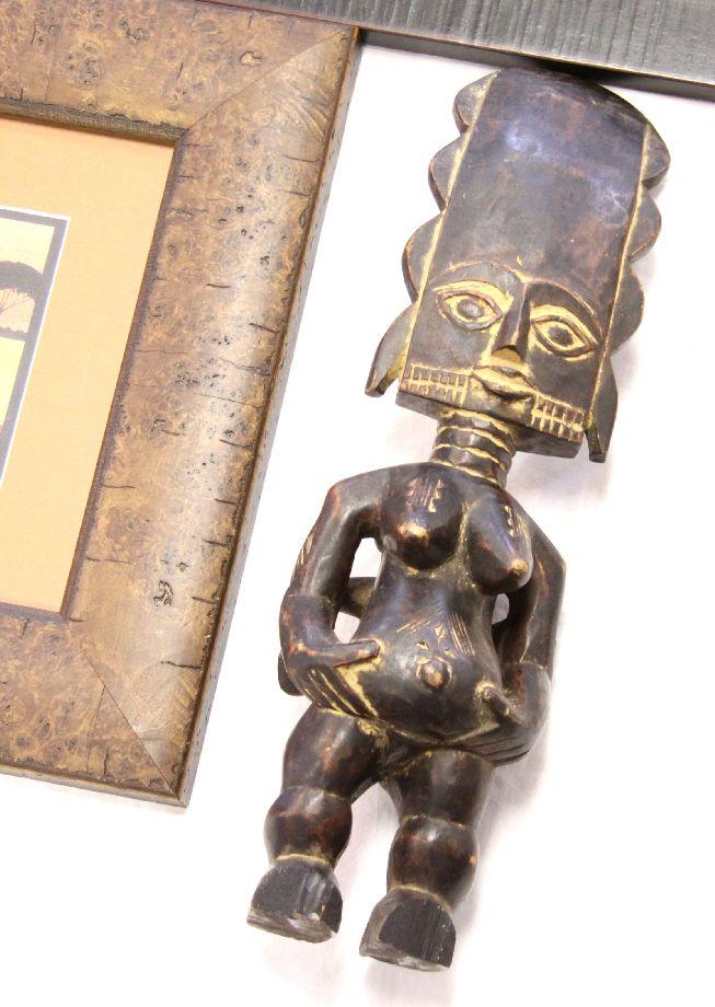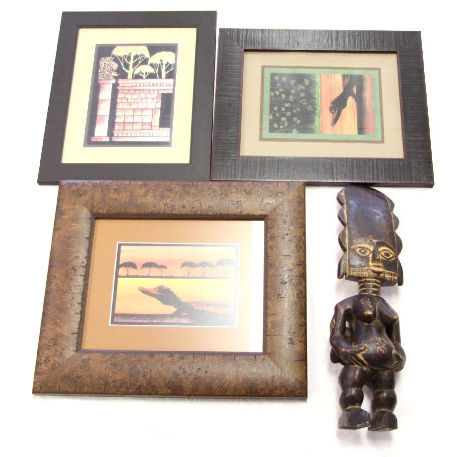 A grouping of African theme art pieces, including a 19 inch carved wooden fertility statue (some damage to feet) and (3) signed limited edition prints by artist J. Randy Smith (American, 20th C.)