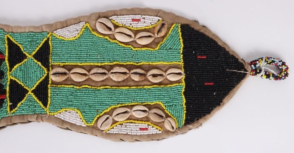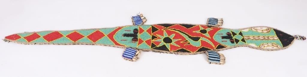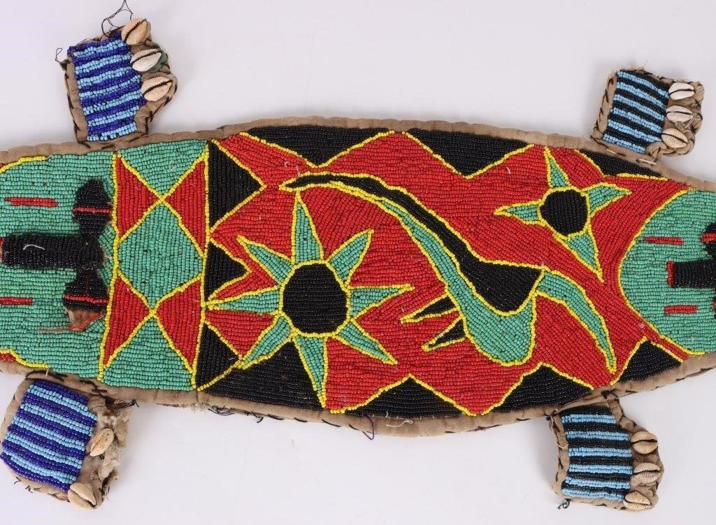 African Yoruba hand-beaded lizard sash/wall piece. The cultural item is a popular and well-known product of the African Yoruba tribe. With sewn-in beads, shells and fabric. The Yoruba people, the largest culture in Nigeria and a significant presence in Africa, boast a rich heritage dating back centuries. Despite enduring exploitation during the era of slavery, they've preserved a profound set of beliefs and rituals, often represented through a prolific artistic output encompassing sculpture, masks, textiles, pottery, and beadwork. Yoruba art, esteemed for its aesthetic allure and cultural significance, prominently features intricate sculptures portraying mythological figures and everyday life.