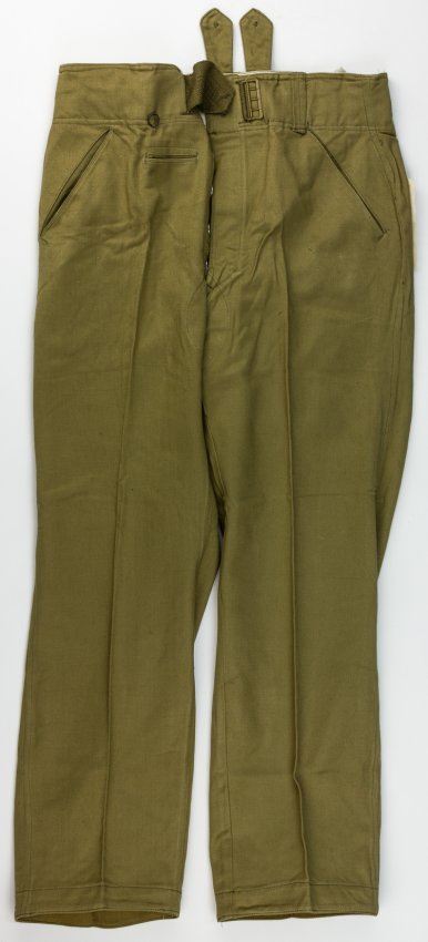 Rare pair of unissued Afrika Korps officer's trousers with maker's paper label still attached, approx. 25" waist, green khaki with four-button fly with two single button tabs at top, two front diagonal slash pockets and a watch pocket at front, one buttoned pocket at rear, with suspender tabs with buttons. Straight legged pants with no cuffs. Fine unissued condition with paper tag tacked to garment by maker "Lago", also with printed name of tailor:"Anton Seemeier" of Landau.