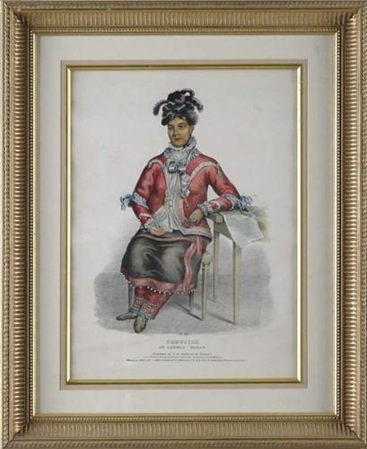 AFTER CHARLES BIRD KING (1785-1862) “TSHUSICK, AN OJIBWAY WOMAN”.  Colored lithograph published by F. W. Greenough, Philadelphia shows an Indian woman dressed in Victorian finery seated next to small table.  Legend dated 1838.  “Drawn, printed and colored at I. T. Bowen’s Lithographic Establishment”.  Found to be a con artist, this woman fooled all of America for a number of years.  Housed in a fine gesso decorated replacement frame with double matte and inner gold lining.  SIGHT SIZE:  17” x 12-1/2”.  CONDITION:  Very good.  9-27117