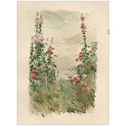 Childe Hassam chromoLithograph "Hollyhocks in Late Summer" - Medium: chromoLithograph (after the watercolor). This beautiful antique print...