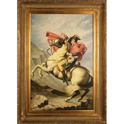 Johnsons? contemporary celebration David?s ?Bonaparte Crossing the Alps? is masterfully rendered. This is a finely detailed portrait, with light brush strokes that give a very dynamic look to this expertly rendered painting. This is a grand painting in homage to both the leader it depicts, and the painter who painted it, measuring 46? high by 31? wide. This wonderful painting is excellently framed in an antique gold toned carved wood frame, for a formal presentation that is a great buy.