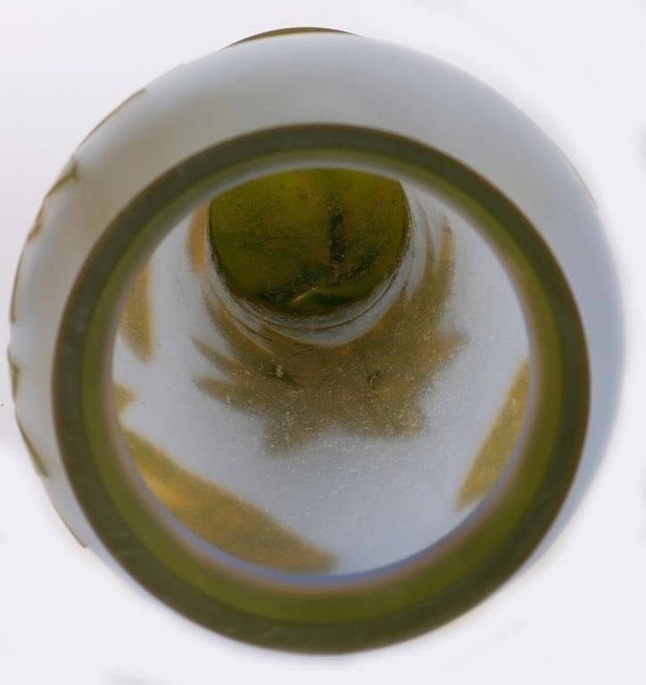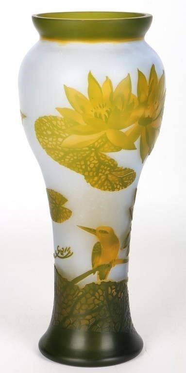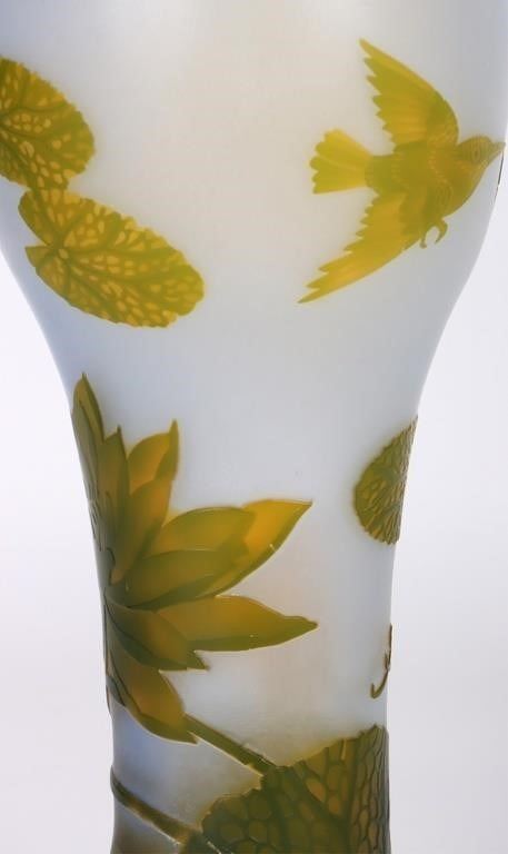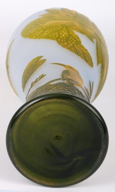 After Emile Galle (French, 1846-1904) Noveau Green & Opaque White Lilies & Hummingbird Cameo vase high end reproduction. Émile Gallé was a French artist and designer who worked in glass, and is considered to be one of the major innovators in the French Art Nouveau movement.