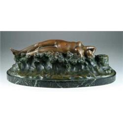 Lot # 1491 AFTER EDOUARD DROUART (French, 1859-1945) RELAXING NUDE. Oval bronze in different color patina has recumbent nude lying on naturalistic base with stump and flowers. Mounted on an oval mottled green marble base. SIZE: 17-1/2” l x 8” w. CONDITION: Very good. 9-97307 (1,250-1,750)