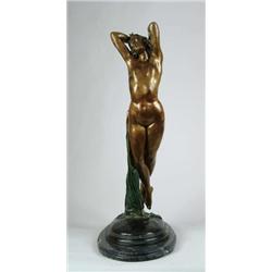 Lot # 1412 AFTER EDOUARD-LOUIS COLLET (1876-) “NOCTURNE”. Large bronze of a standing nude woman with green draped cloth. Her feet do not touch but is supported by the cloth. She wears a five-pointed star atop her head with arms and hands behind holding hair. Oval base mounted on a molded oval marble base. Signed “Collet” on base. SIZE: Bronze is 36” h; overall 38”. CONDITION: Very good. 9-97274 (2,750-3,250)