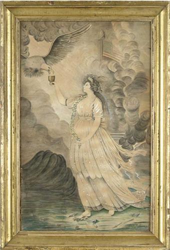 AFTER EDWARD SAVAGE (American, 1761-1817) LIBERTY-GODDESS OF YOUTH GIVING SUPPORT TO THE “BALD EAGLE”. Outstanding early watercolor shows Liberty clad in flowing white draperies and a garland of spring flowers, the newly embodied goddess tramples the symbols of monarchy: a key, the medal and garter of a royal order, and a broken scepter. The eagle, symbol of the Republic, descends on shafts of light, to be nourished by Liberty. The flag of the union, topped by a liberty cap, is visible through the clouds of war, which spew lightning to drive the British fleet from Boston Harbor. Behind is seen a domed building next to a body of water with several sailing ships. On the back is an original penned label with the following: “Liberty in the form of the “Goddess of Youth” giving support to the “Bald Eagle”. Copied by Rachael Lincoln and given by her to her daughter Emily Gilbert”. Housed in what appears to be its original gilt molded wood frame. SIGHT SIZE: 22-3/4” x 14”. CONDITION: Good, some toning. There is evidence of a cut line in the left corner but intact. 9-27116