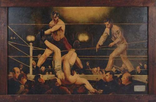 AFTER GEORGE WESLEY BELLOWS (American, 1882-1925) "DEMPSEY - FIRPO". Large oil on masonite fight scene after the famous lithograph by Bellows of the same title. The scene shows Dempsey falling through the ropes after being hit hard by Firpo. A large group of spectators is seen around the ring. The painting has a silver plaque on bottom right which states "Dempsey-Firpo Sept. 14, 1923 Gift of National Equipment Corp. Fall River, Mass". The painting has a flat wide pine frame and the painting bears no signature. The history is that this was displayed in a bar room in the New Bedford/Fall River, Massachusetts area. This fight was very controversial due to Dempsey being out of the ring for 10 seconds and coming back and in two rounds winning the fight. SIZE: 48" x 77". CONDITION: Generally good. Some minor scrapes and chips. 9-27782