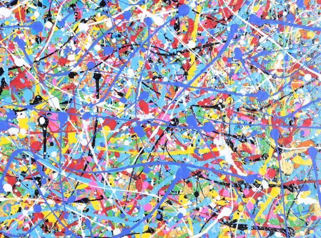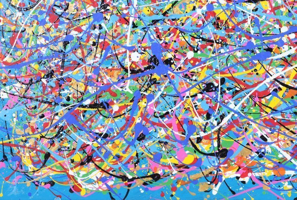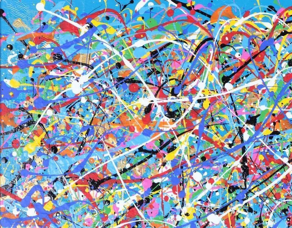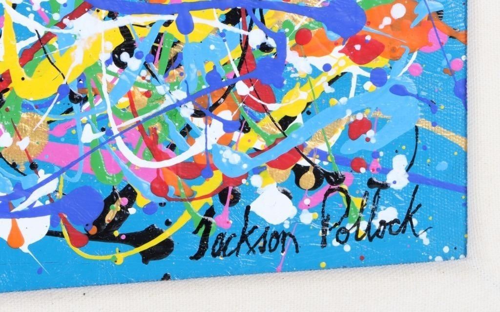 After Jackson Pollock (1912-1956, American) original oil abstract painting. This painting was created by an unknown artist after the time of Pollock. Pollock was widely noticed for his "drip technique" of pouring or splashing liquid household paint onto a horizontal surface, enabling him to view and paint his canvases from all angles. It was called all-over painting and action painting, since he covered the entire canvas and used the force of his whole body to paint, often in a frenetic dancing style.
