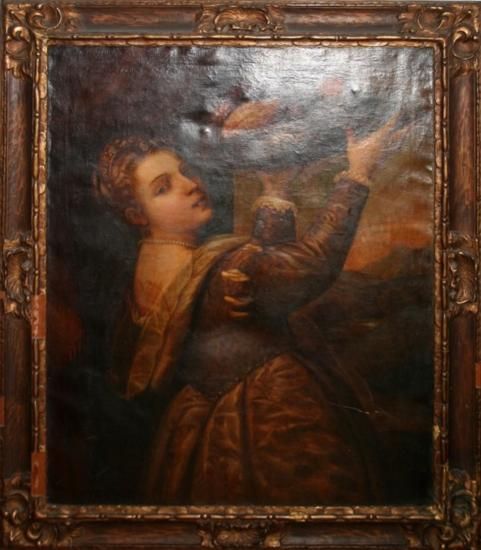 AFTER TITIAN, OIL ON CANVAS, 19TH C, 41in X 32in, 'YOUNG WOMAN WITH A DISH OF FRUIT':depicts a woman (Titian's Daughter Lavinia) carrying a dish of fruit above her head; carved gilt wood and gesso frame; From the Estate of Walter Lincoln Fry, Industrialist and global trader. (Fry Glass).