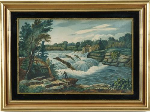 AFTER WILLIAM GUY WALL (American, 1792-) BAKERS FALLS. Unsigned 19th Century watercolor of Bakers Falls, New York after a print from the painting by William Guy Wall. The scene shows a cascading waterfall with mill having rocky banks and man standing on rock. Housed in a gilt molded wood replacement frame with reverse painted black and gold glass matte. On reverse is old description indicating the watercolor is a rendition of the Brunswick, Maine dam and mill on the Androscoggin River. SIGHT SIZE: 14in. x 21in.. CONDITION: Very good. 9-26060
