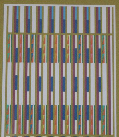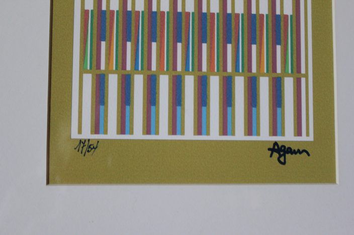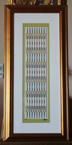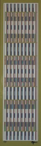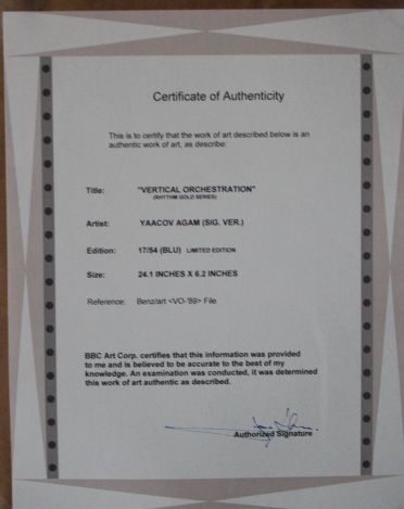 YAACOV AGAM HAND SIGNED "BLUE VERTICAL ORCHESTRATION" GOLD EDITION - HAND SIGNED AND NUMBERED BY THE ARTIST - PROFESSIONALLY FRAMED - COMES WITH CERTIFICATE OF AUTHENTICITY - FRAME MEASURE APPX 36 INCHES X 17 INCHES