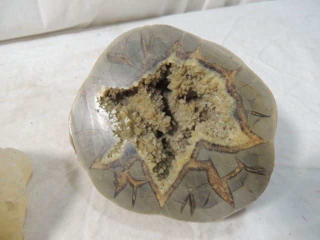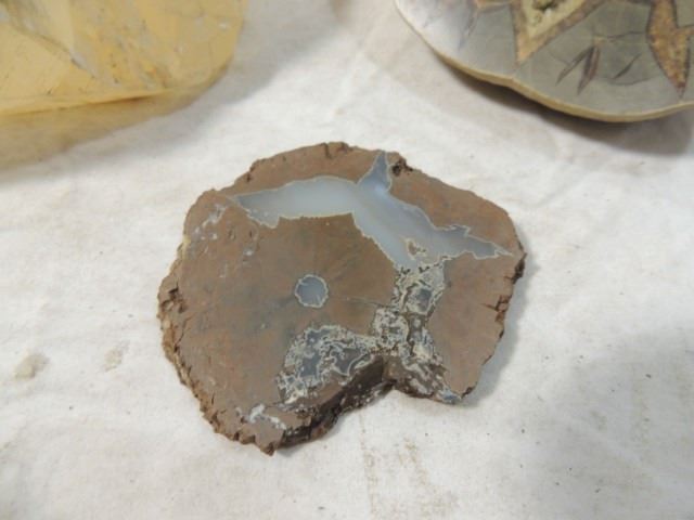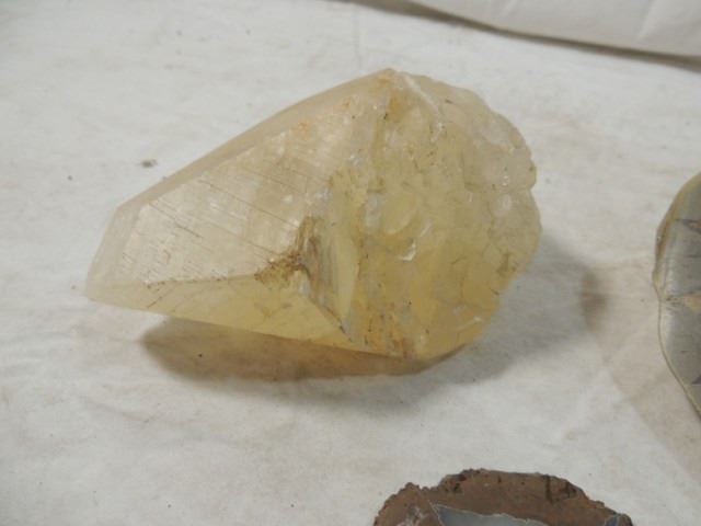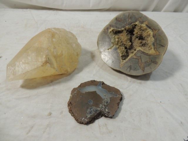 THREE PIECES. SLICED OPEN CRYSTAL GEODE AND LARGE PIECE OF QUARTZ. AND A NICE SLICE OF QUARTZ, AS SHOWN. CHECK OUT THE PICTURES! ABOUT 6" ACROSS AND 8" LONG. NICE!