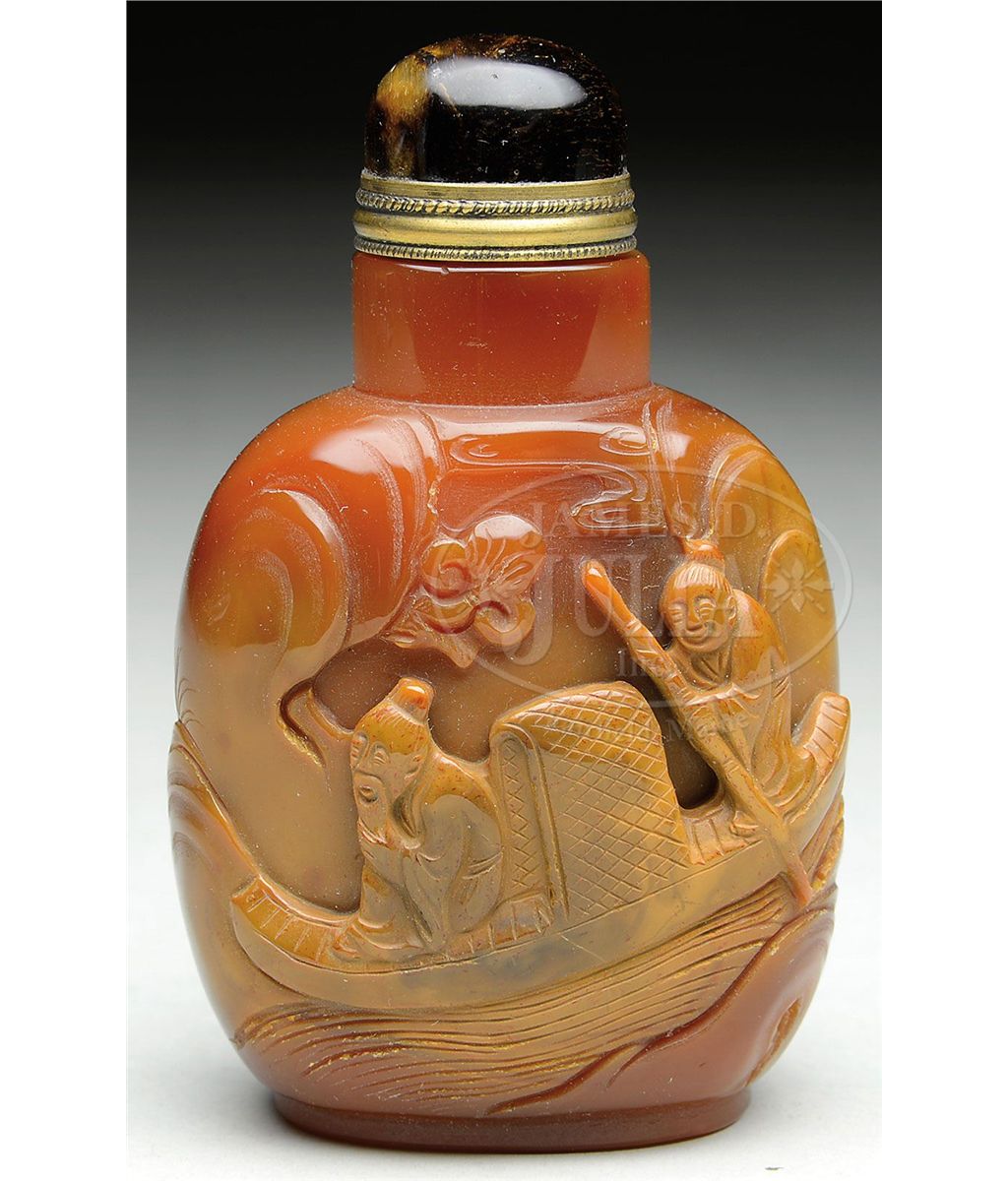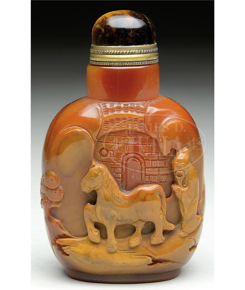 20th century, China. Well hollowed. Butterscotch and amber colored stone. Carving of a scholar in a boat and a horse before a city gate. SIZE: 2-3/4" t. CONDITION: Cap absent, otherwise very good. 7-70488
