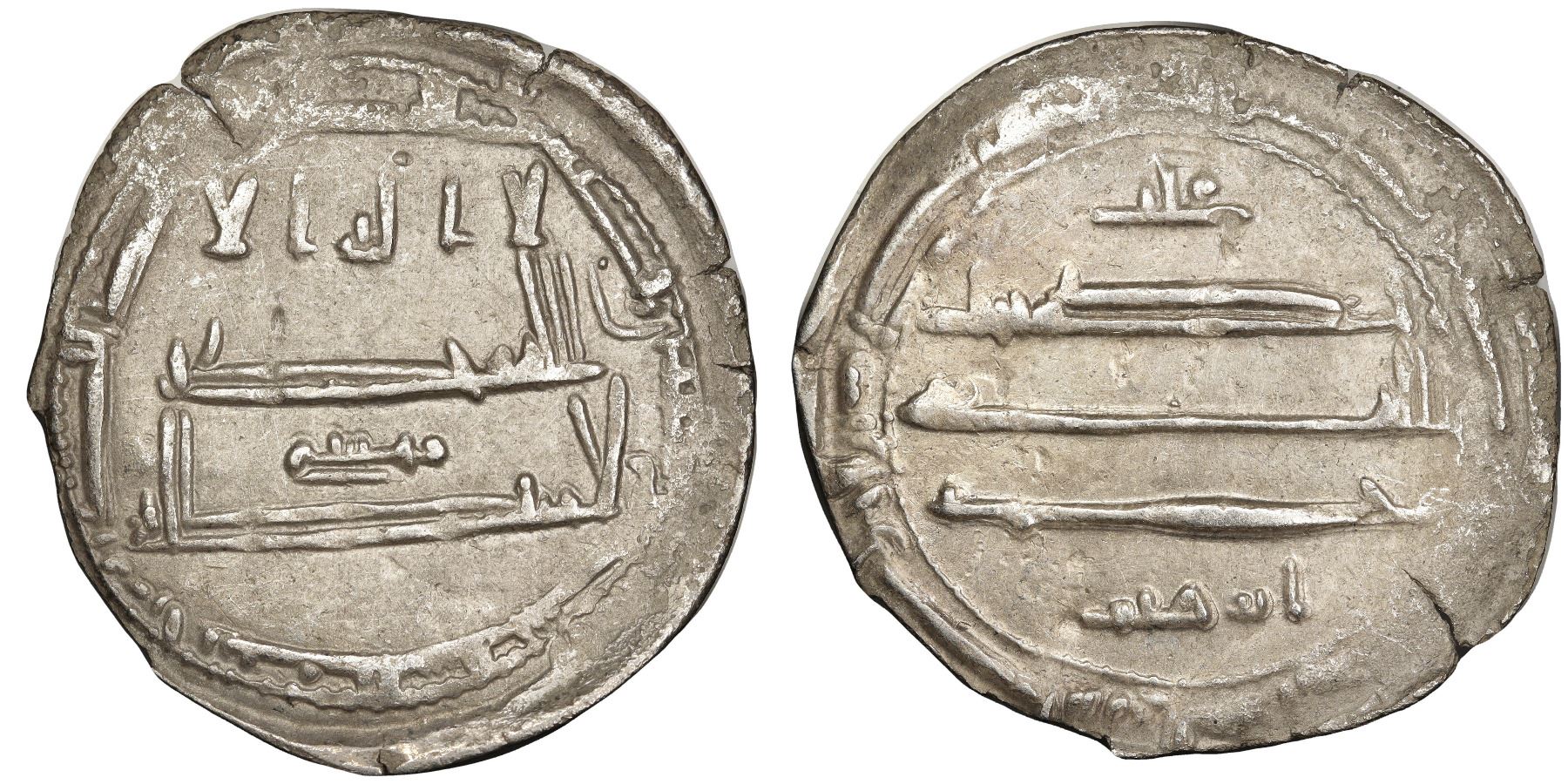 The date on this piece is oddly spelled. The last letter is clearly not the letter waw but rather the letter 'ayn that extends downward towards the word "la" in the last line of the obverse field, as is clearer with another example appearing in St James's auction 34 (lot 623), also possibly misidentified as AH 196. The only sensible possibilities would be AH 194 or a posthumous issue of AH 197, both of which would be unpublished since the only recorded dates for Ibrahim dirhams citing Musa are AH 195 and 196.