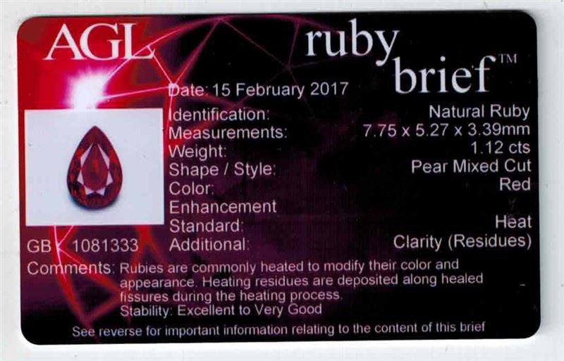 1.12ct Ruby-AGL Pear Cut AGL# GB 1081333 7.75 x 5.27 x 3.39 #R-803
