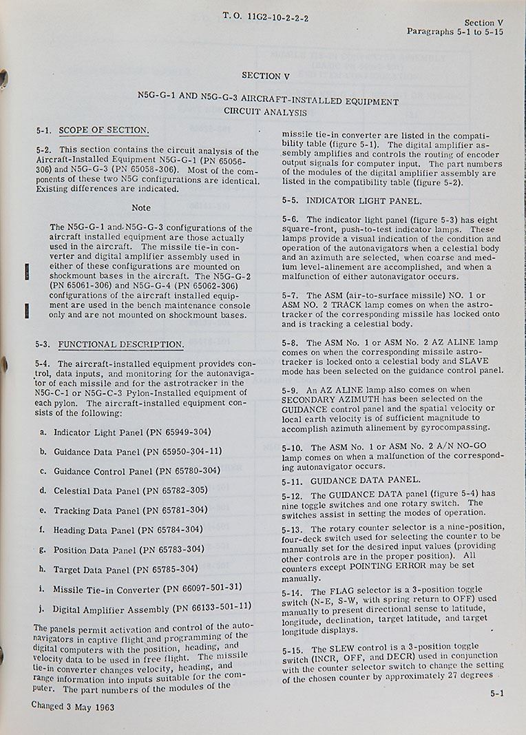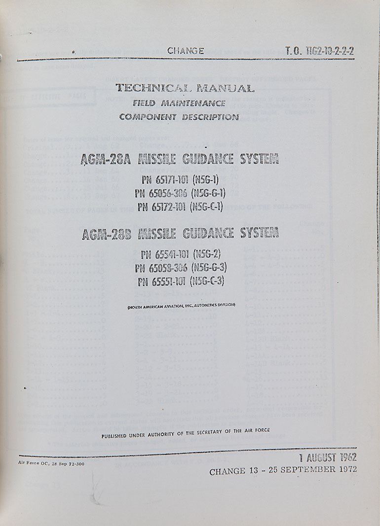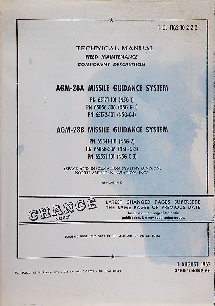 Period circa 1960–1970s copy of the US Air Force "Technical Manual: Field Maintenance, Component Description" manual for the AGM-28A and AGM-28B Missile Guidance Systems, issued on August 1, 1962, with several revision portions dated as late as 1972. The several hundred page manual primarily contains detailed circuitry diagrams and schematics, interspersed with descriptions of the various components of the missile's guidance system. In very good condition, with dampstaining to the title page and several pages toward the rear of the manual. The North American Aviation AGM-28 Hound Dog was a supersonic, turbojet-propelled, air-launched cruise missile developed in 1959 for the United States Air Force, designed to be capable of attacking Soviet ground-based air defense sites.