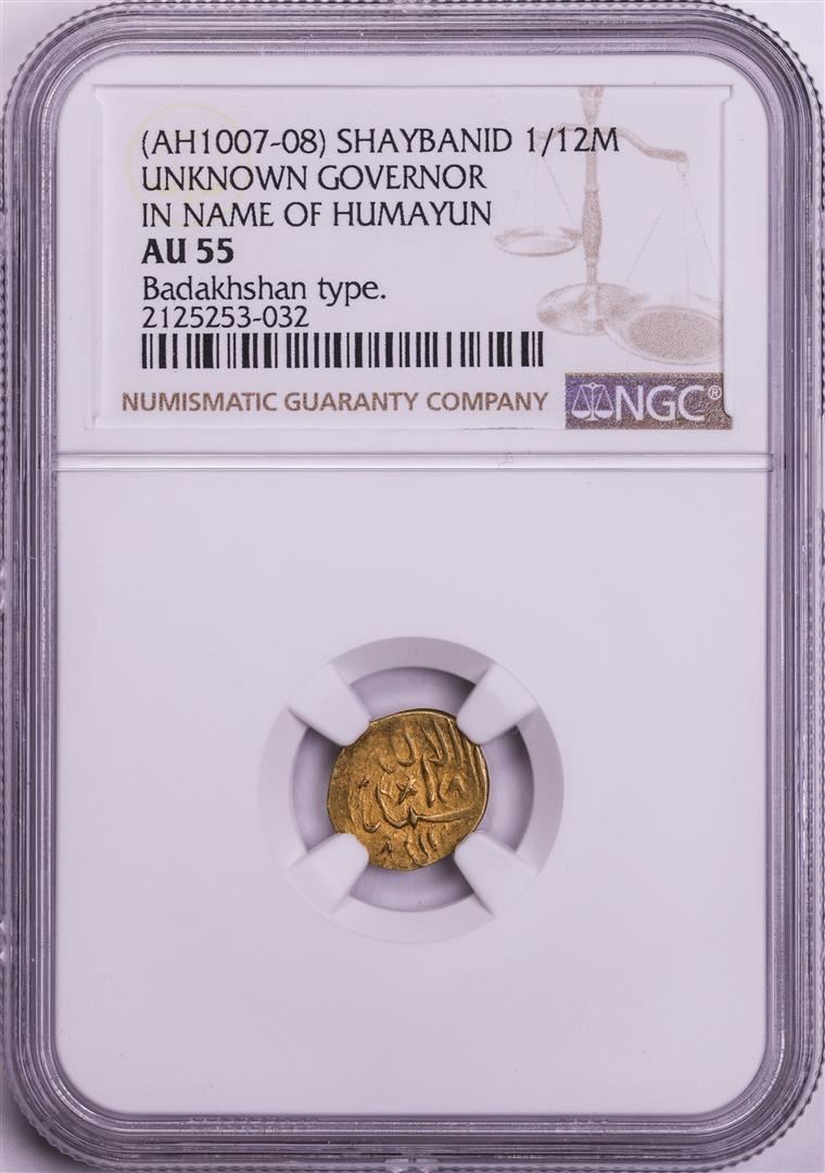 One AH1007-08 Shaybanid 1/12 Mohur Gov. in Name of Humayun Badakhshan Gold Coin NGC AU55. NGC Certified.