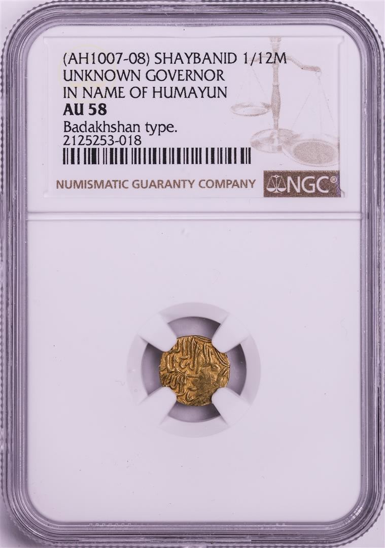 One AH1007-08 Shaybanid 1/12 Mohur Gov. in Name of Humayun Badakhshan Gold Coin NGC AU58. NGC Certified.