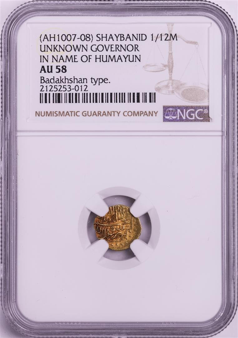 One AH1007-08 Shaybanid 1/12 Mohur Gov. in Name of Humayun Badakhshan Gold Coin NGC AU58. NGC Certified.