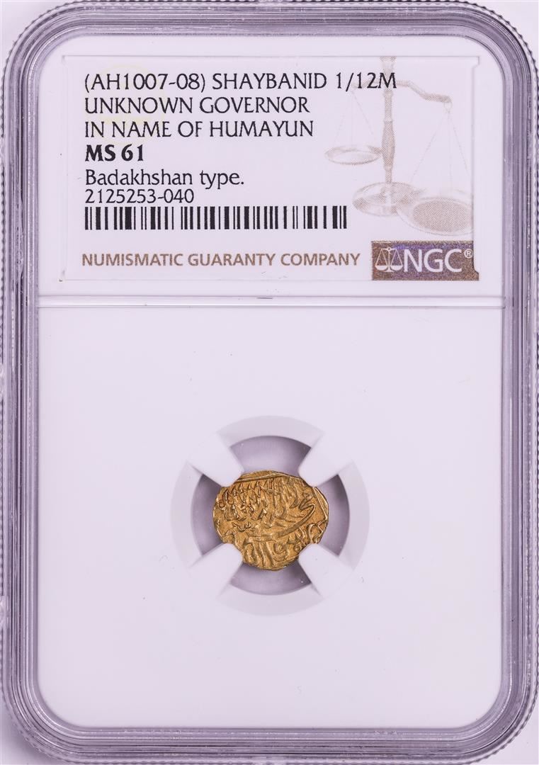 One AH1007-08 Shaybanid 1/12 Mohur Gov. in Name of Humayun Badakhshan Gold Coin NGC MS61. NGC Certified.