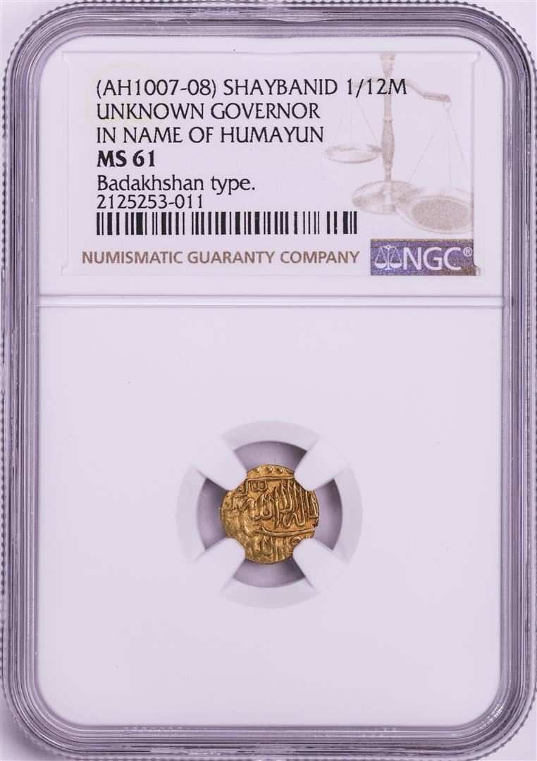 One AH1007-08 Shaybanid 1/12 Mohur Gov. in Name of Humayun Badakhshan Gold Coin NGC MS61. NGC Certified.