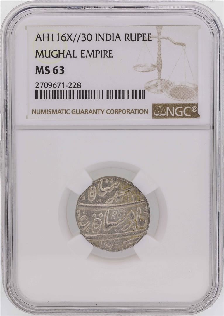 One AH116X//30 India Rupee Mughal Empire Coin NGC MS63. NGC Certified.