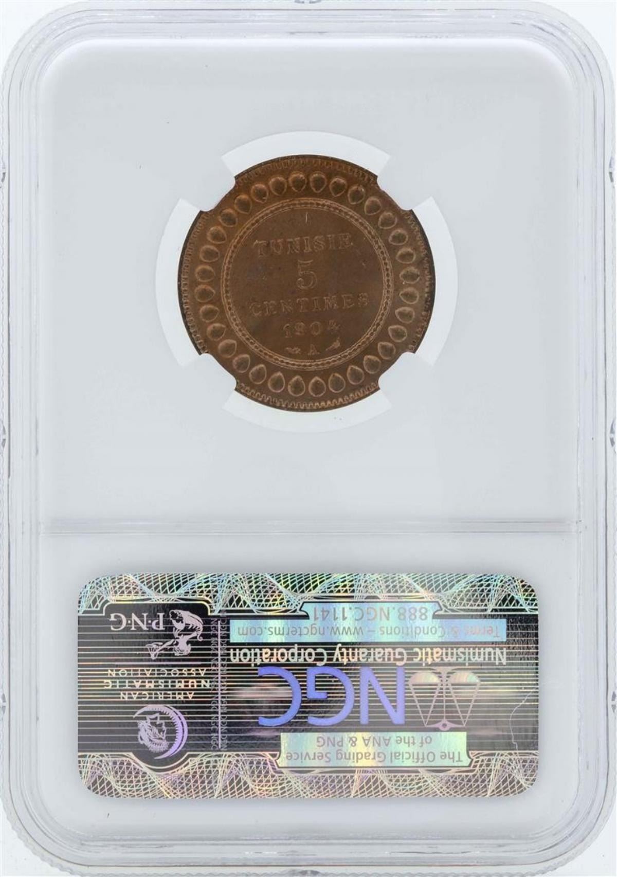 One AH1322/1904A Tunisia 5 Centimes Coin NGC MS64RD. NGC Certified.