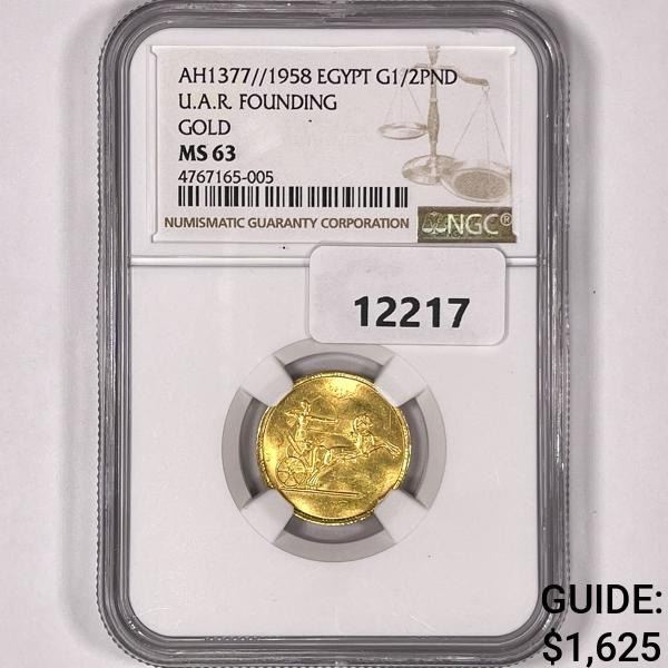 AH1377//1958 Egypt Gold 1/2PND U.A.R. NGC-MS63