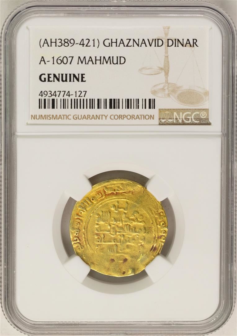 One AH389-421 Ghaznavid Dinar A-1607 Mahmud Gold Coin NGC Genuine. NGC Certified.