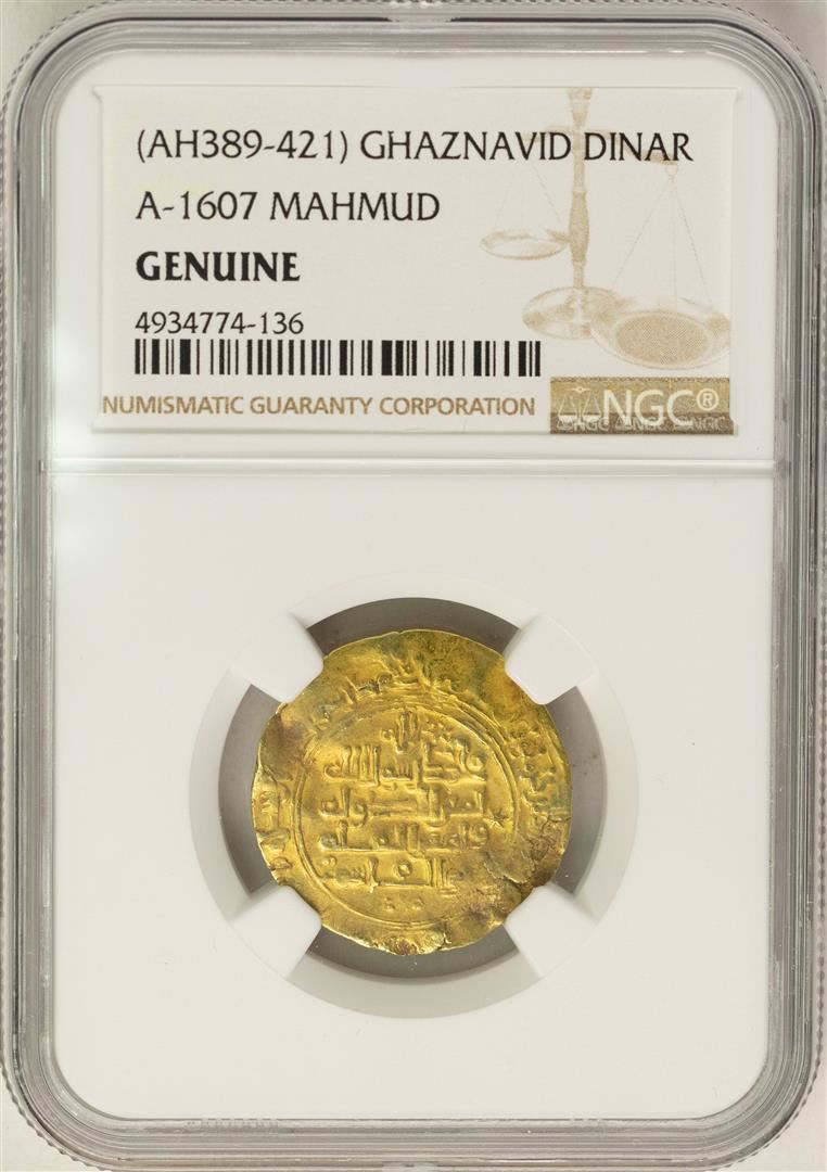 One AH389-421 Ghaznavid Dinar A-1607 Mahmud Gold Coin NGC Genuine. NGC Certified.
