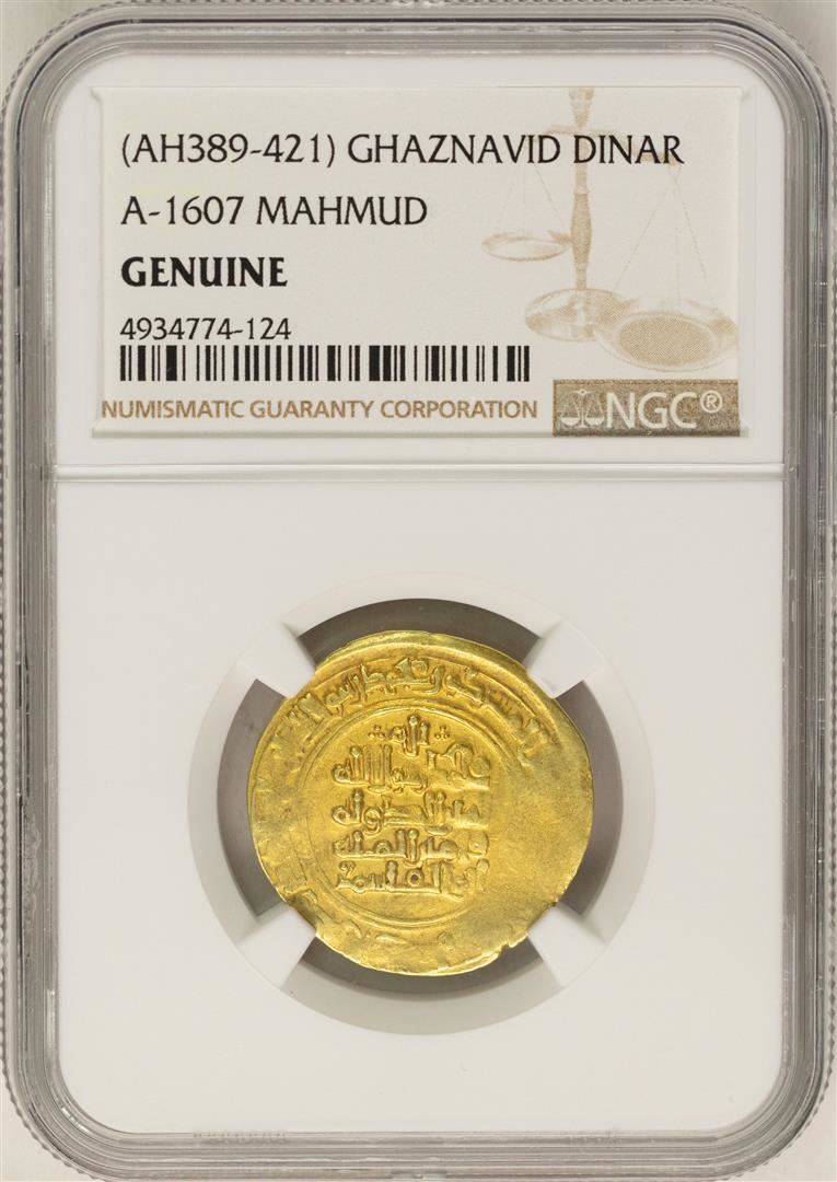 One AH389-421 Ghaznavid Dinar A-1607 Mahmud Gold Coin NGC Genuine. NGC Certified.